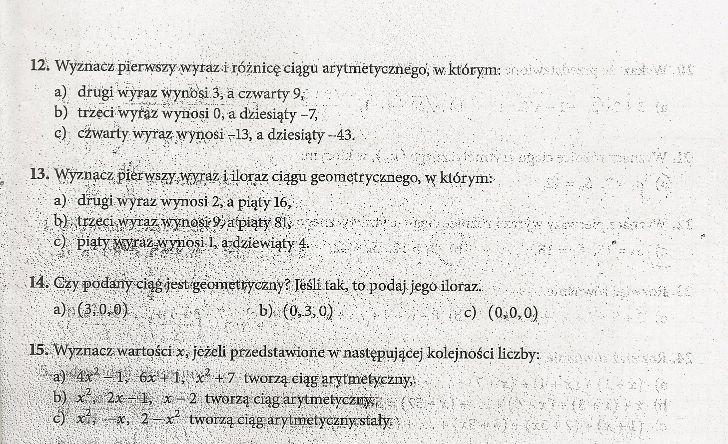 12. Układamy dwa równania typu: an = a1 + (n-1) r; odejmujemy stronami i obliczamy różnicę r, następnie z któregokolwiek równania pierwszy wyraz a1.