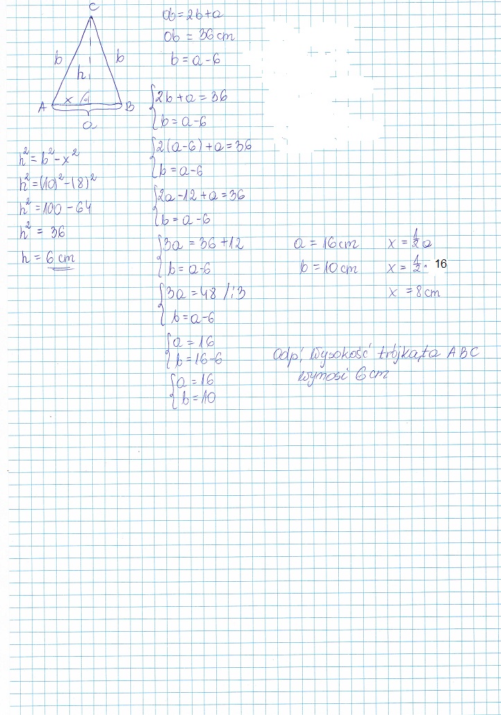 oblicz wysokość trójkąta równoramiennego,którego obwód jest równy 36 cm,a ramię jest o 6cm krótsze od podstawy