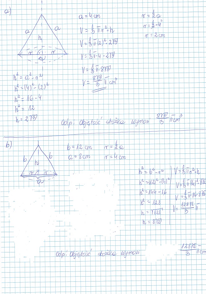 b) trójkąta równoramiennego o podstawie 8cm i ramieniu 12cm wokół wysokości poprowadzonej do podstawy.