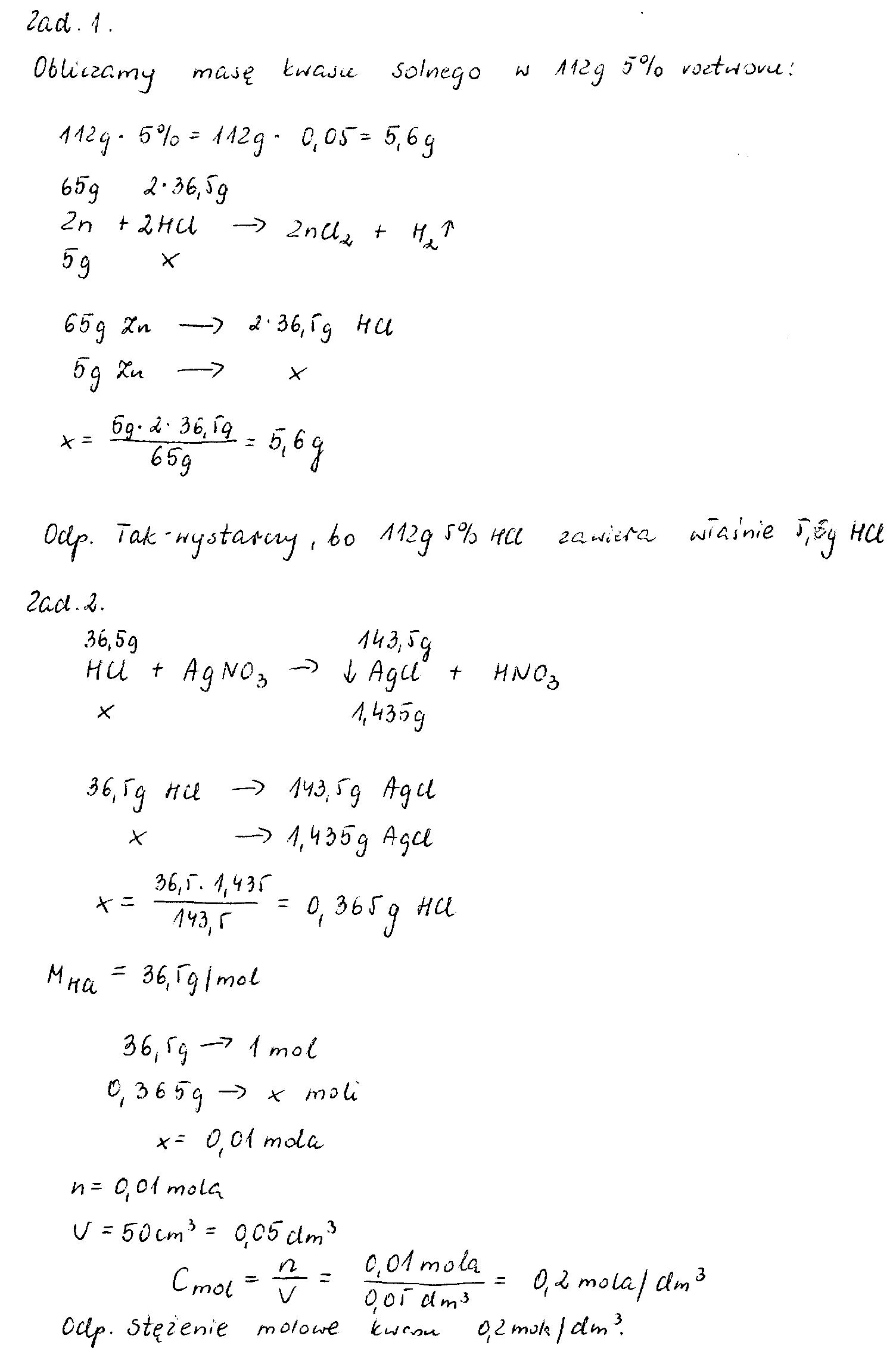 1.Czy wystarczy 112g 5% HCl do rozpuszczena 5g Zn?