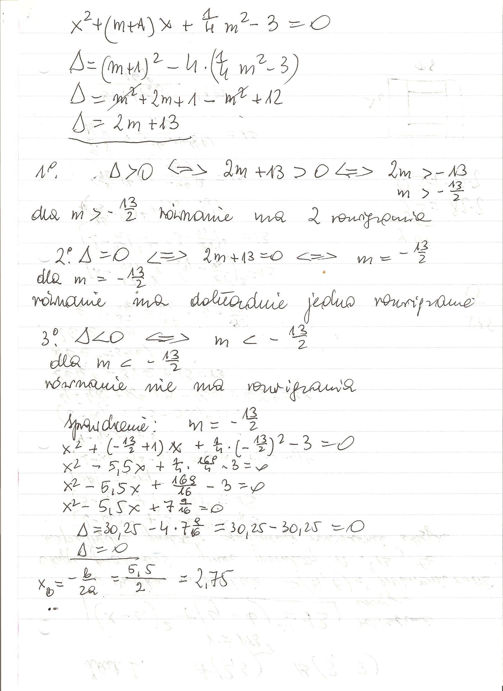 Zbadaj dla jakich wartosci parametru "m" równanie x2 +(m+1)x+1/4 m2-3=0