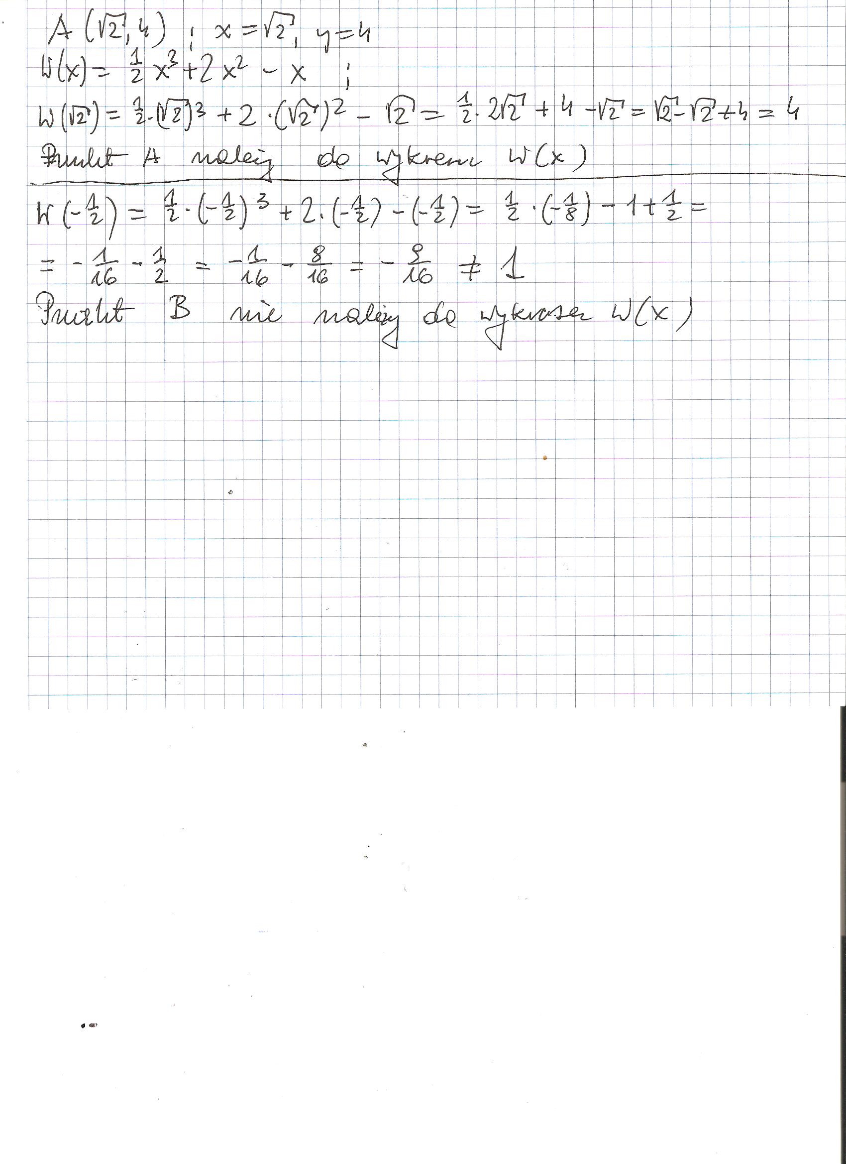 sprawdź czy punkty A(pierwiastek z 2 i 4) i B(-jedna druga i 1) należą do wykresu wielomianu w(x)=xdo trzeciej potęgi podzielić na dwa + 2xdo potęgi drugiej - x