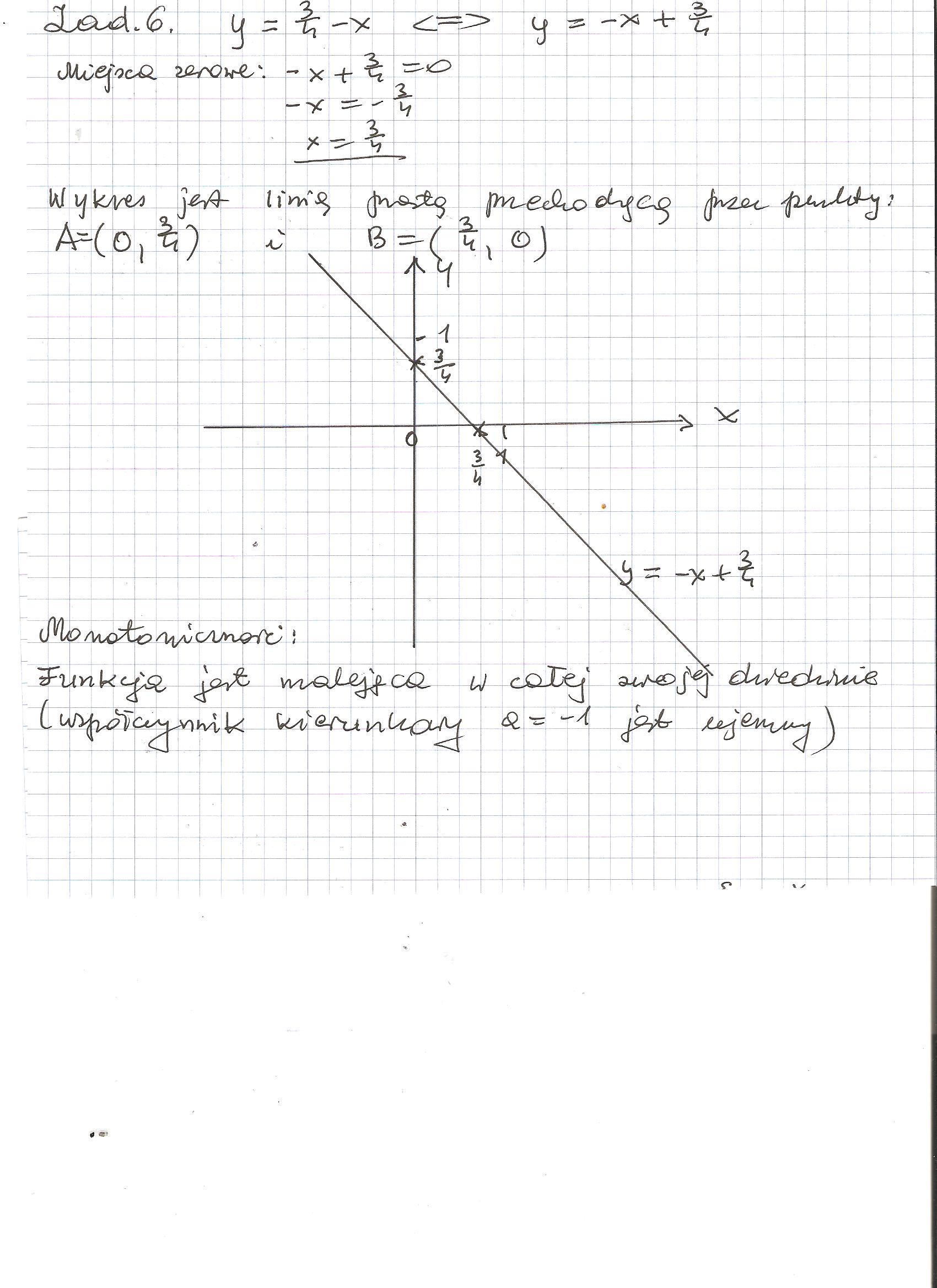 6) narysuj wykres funkcji y=3/4-x podaj monotonnosc i miejsce zerowe