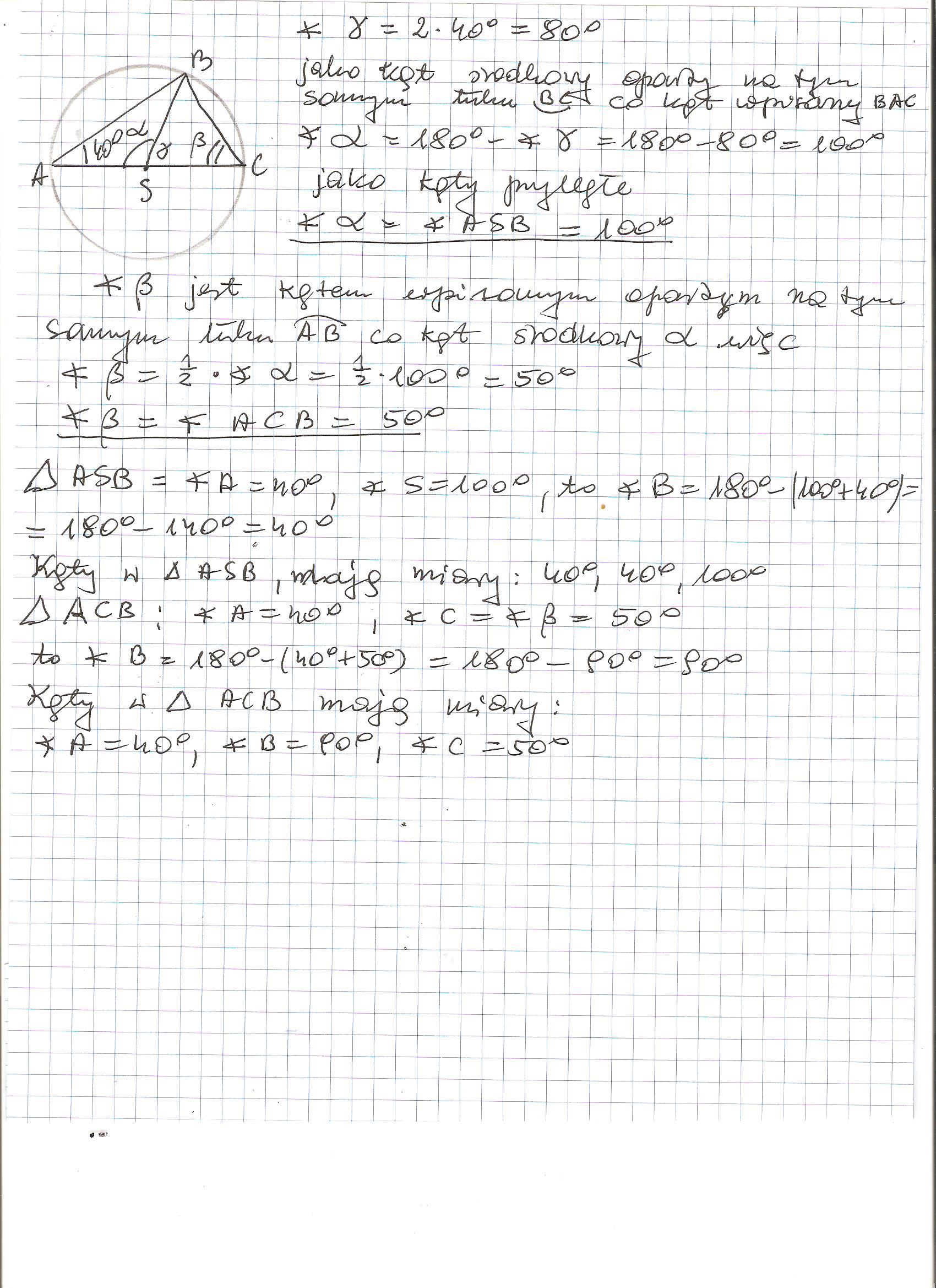 Kąt między średnicą AC i cięciwą AB okręgu o środku S jest równy 40°.Wyznacz kąty