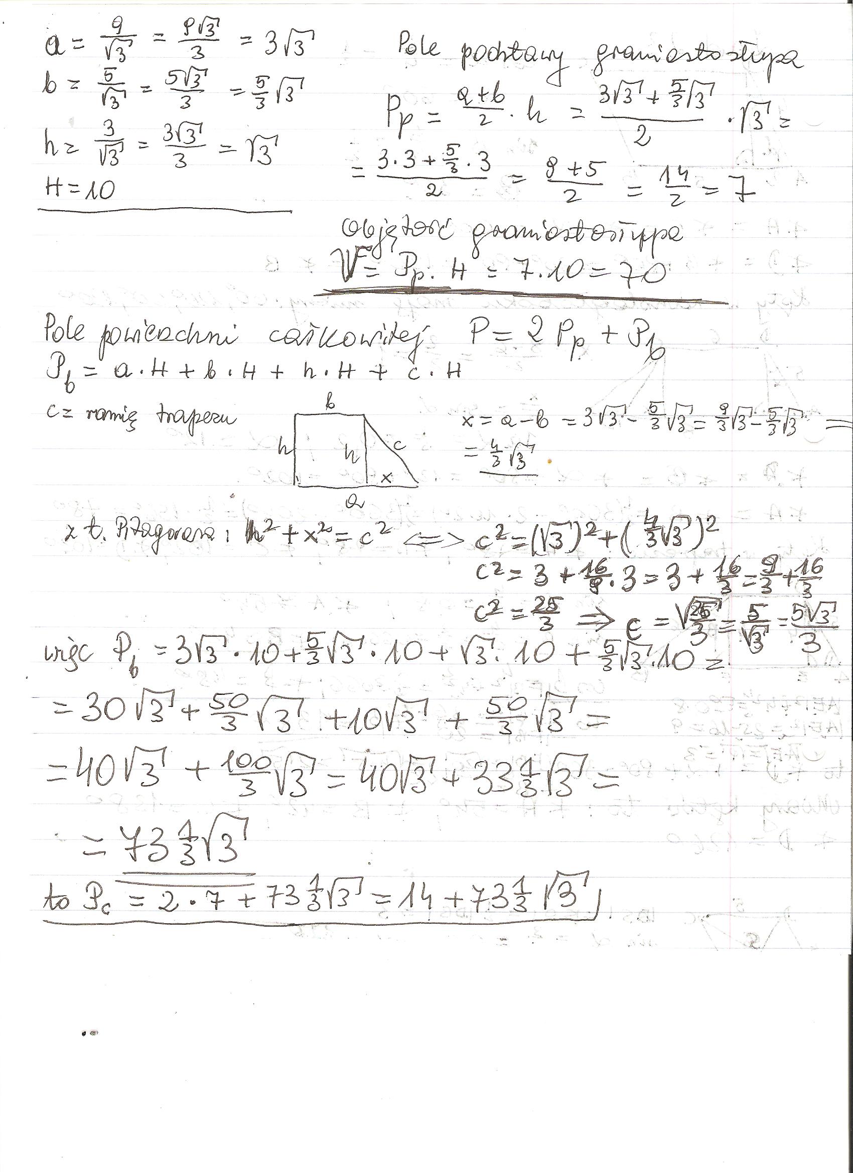 Oblicz pole całkowite i objętość graniastosłupa prostego o podstawie trapezu prostokątnego, którego podstawy wynoszą odpowiednio a= 9\sqrt3, b=5\sqrt3 i wysokości trapezu h=3\sqrt3 . Wysokość graniastosłupa H=10.