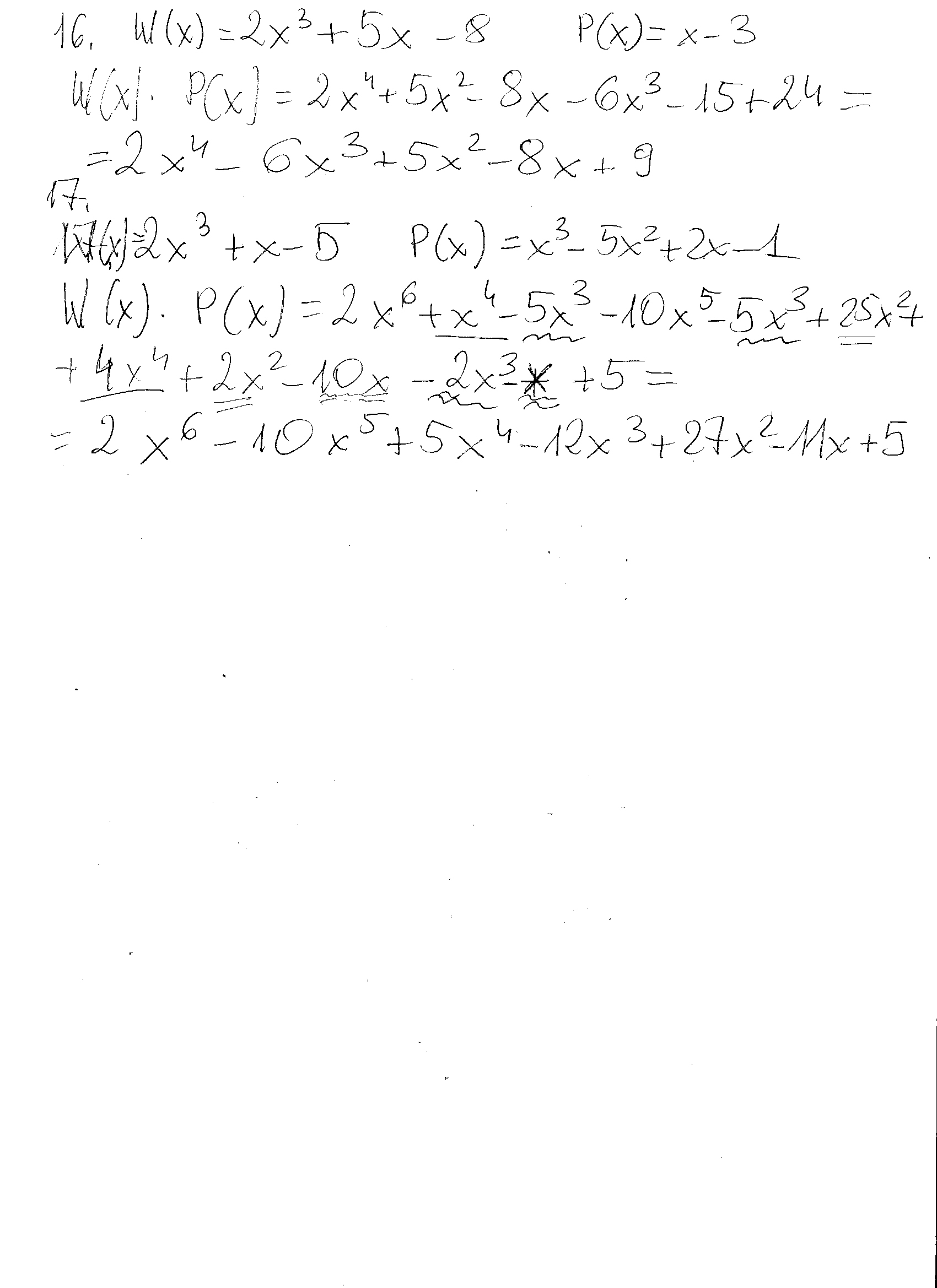 16)dane są wielomiany W(x)= 2x^3+5x-8 i P(x)= x-3 oblicz W(x)*P(x)