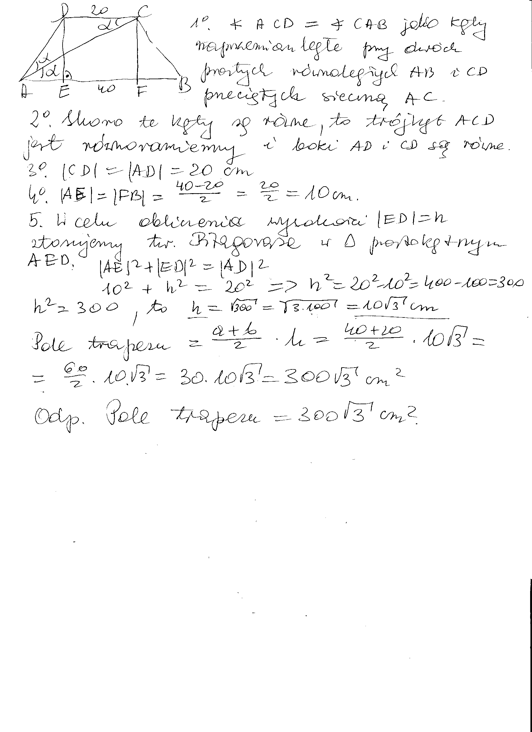 Oblicz pole trapezu, jeżeli trapez jest równoramienny, jego podstawy maja długosc 20 cm i 40 cm, a przkatna dzieli kat przy dłuzszej podstawie na dwa przystajace katy.