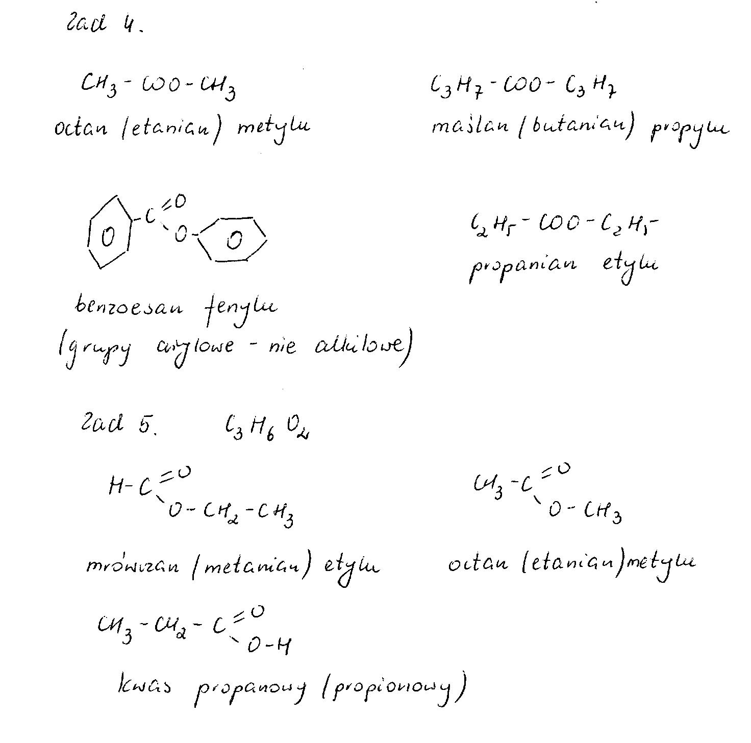3. Cztery Estry mają taki sam wzór sumaryczny C5H10O2, napisz ich wzory sumaryczne (podając alkil pochodzący od kwasu i alkil pochodzący od alkoholu ) oraz wzory strukturalne