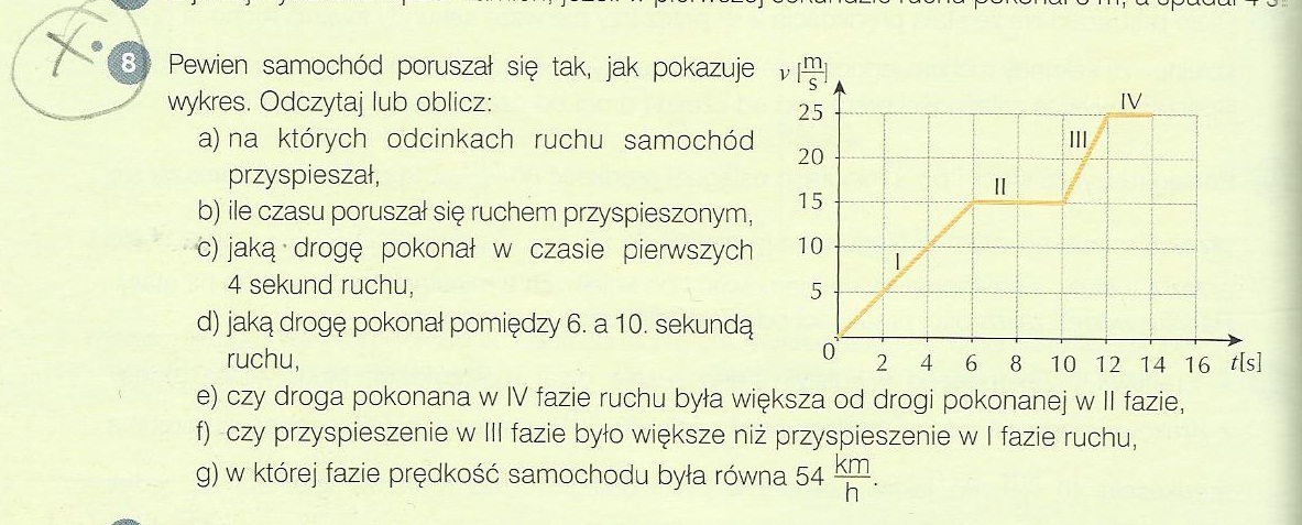 g) 54 km/h to 15 m /s czyli w II fazie ruchu ciało poruszało się z taką prędkością