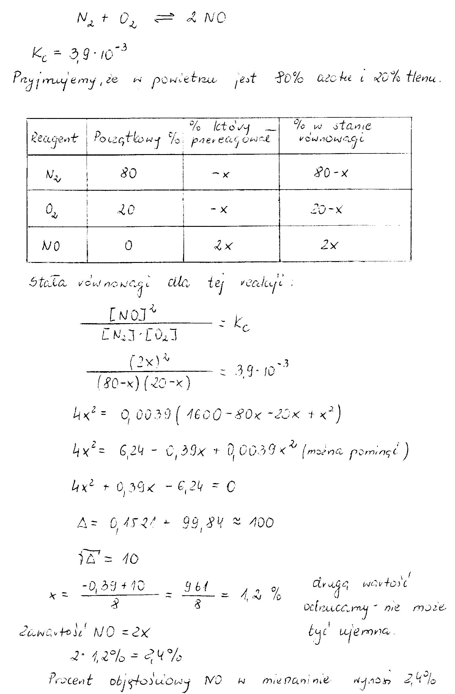 N_2 + O_2 <-> 2 NO o stałej Kc = 3,9*10^-^3. Oblicz % objętościową zawartość NO w uzyskanej mieszaninie