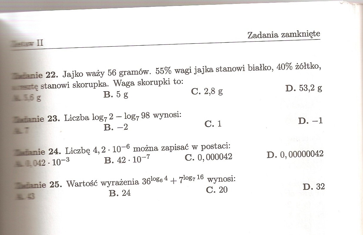 Zad. 11. \left(7^{-0,7}\,:\,7^{\frac{2}{5}}\cdot 7^{-0,9}\right)^{\frac{1}{2}} = 7^{(-0,7-0,4-0,9)/2} = 7^{-1} = \frac{1}{7} Odp. A Zad. 12. Odp. C Zad. 13. [(1+\sqrt{5})^2 - (1-\sqrt{5})^2]^2 = [1+2\sqrt{5}+5-1+2\sqrt{5}-5]^2 = 80 Odp. B. Zad. 14. 0,8 * (0,9 * x) = 0,72 x = 360 więc x = 360 / 0,72 = 500. Odp. B. Zad. 15. Odp. B. Zad 16.Odp. D. Zad. 17. Odp. D. Zad. 18. Odp. C. dzielniki 60: 1, 2, 3, 5, 6, 10, 12, 15, 20, 30, 60 Zad 19. 100% * 22/40 = 55% Odp. B. Zad 20 (2^6)^7\,:\,8^{13} = (2^6)^7\,:\,(2^3)^{13} = 2^{42-39} = 2^3 Odp. B. Zad. 21. Odp. B. Zad. 22. Skorupka stanowi 5% z 56 g = 2,8 g. Odp. C. Zad. 23. \log_7 2 - \log_7 98 = \log_7\left(\frac{2}{98}\right) = -\log_7 49 = -2 Odp. B. Zad. 24. Odp. B. Zad 25. 36^{\log_6 4} + 7^{\log_7 16} = (6^2)^{\log_6 4} + 16 = (6^{\log_6} 4)^2 + 16 = 4^2 + 16 = 32 Odp. D.