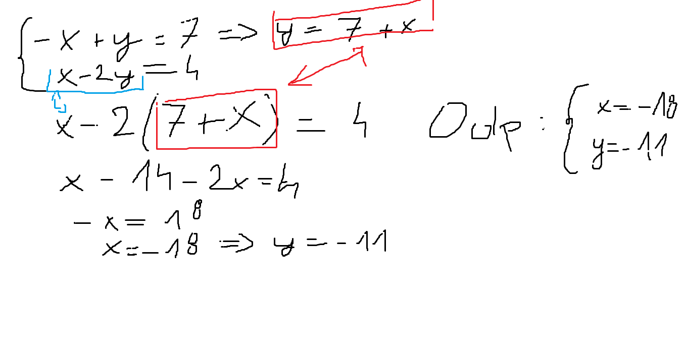 -x+y=7 x-2y=4 -x + y= 7 x= 4 + 2y -(4 + 2y) + y = 7 x= 4 + 2y -4 - 2y + y = 7 x= 4 + 2y -y = 7 + 4 x= 4 + 2y -y = 11 /*(-1) x = 4 + 2y y= -11 x = 4 + 2(-11) y= -11 x= 4 - 22 y= - 11 x= - 18 spr. -x+y=7 -(-18) + (-11) = 7 18 - 11= 7 7 = 7 L=P x-2y=4 - 18 - 2(-11) = 4 - 18 + 22= 4 4=4 L=P
