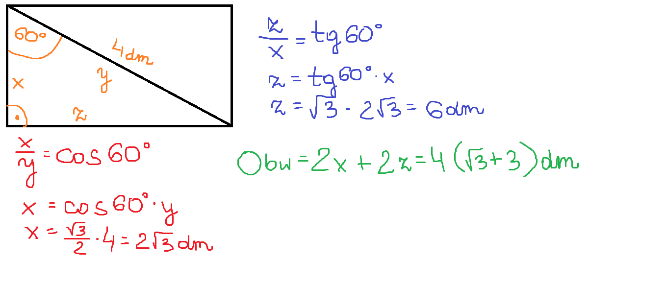 oblicz obwód prostokąta wiedząc ze jego przekątna długości 4dm tworzy z jednym z boków kąt 60 stopni.