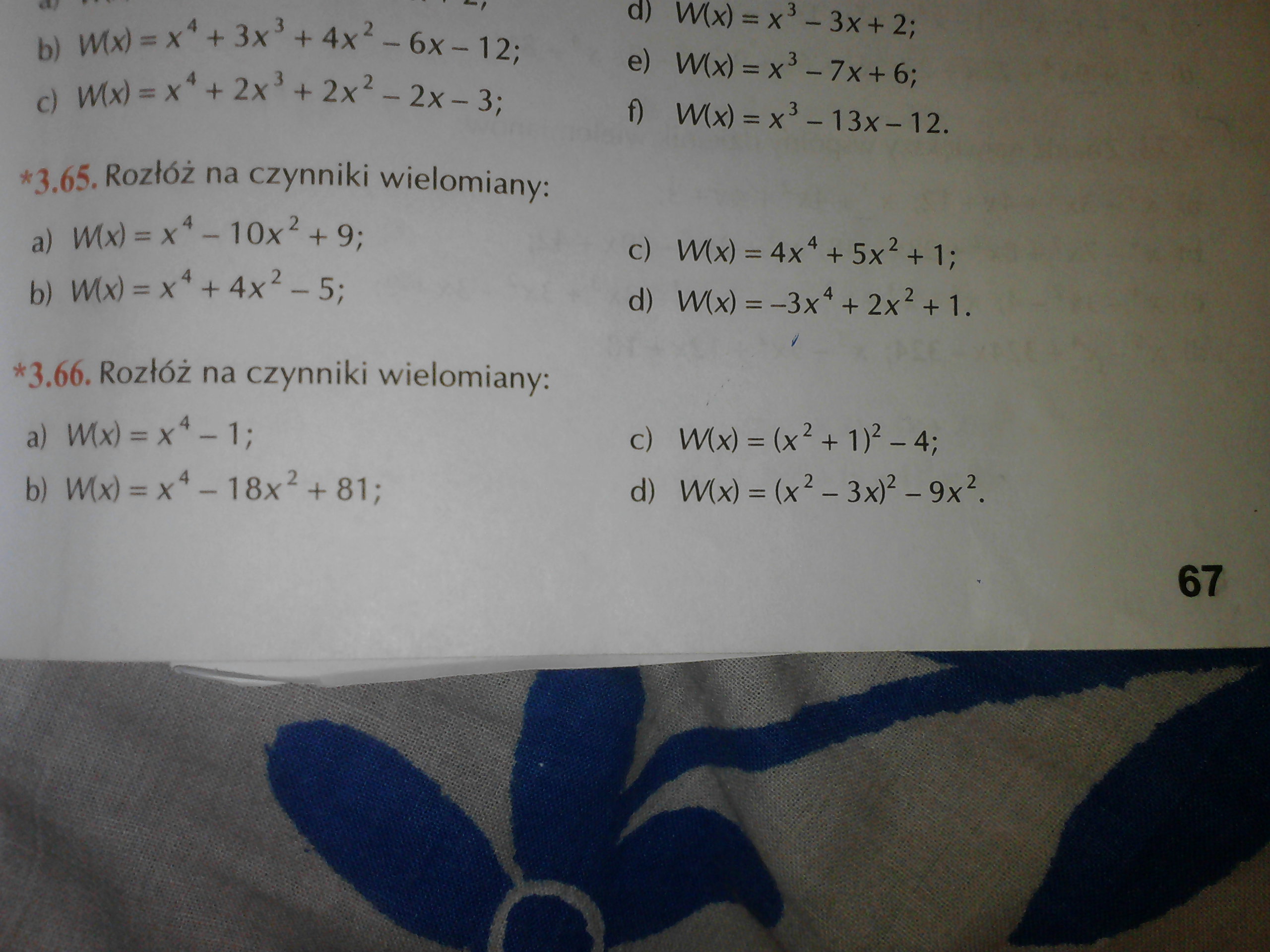 Wszystkie wielomiany to funkcje dwukwadratowe, można podstawiać y = x^2, odgadywać pierwiastki ze wzorów Viete'a, potem jeszcze wyrażenia typu x^2 - a^2 rozkładać na (x-a)(x+a)