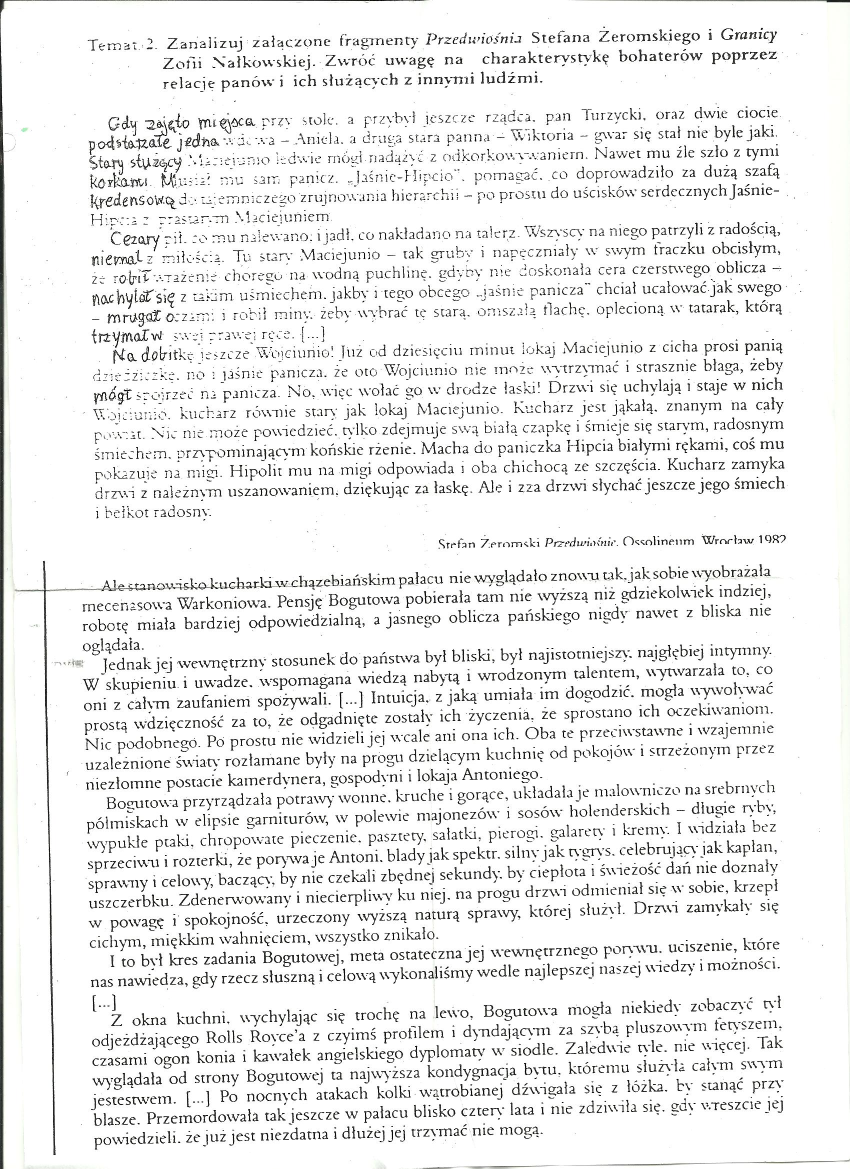 Zanalizuj załączone fragmenty 'Przedwiośnia' S.Żeromskiego i 'Granicy' Z.Nałkowskiej. Zwróć uwagę na charakterystykę bohaterów poprzez relację panów i ich służących z innymi ludźmi