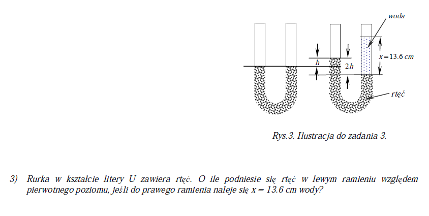 Parcie, wywoływane przez słup wody (o wysokości x) w prawym ramieniu rurki musi być równoważone przez parcie słupa rtęci (o wysokości 2h) w lewym ramieniu. Ponieważ przekroje ramion są jednakowe to równość sił tarcia oznacza równość ciśnień czyli (g to przyspieszenie ziemskie, skraca się)