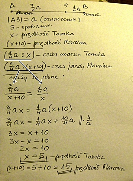 Marcin był na wakacjach w miejscowości A, a Tomek w miejscowości B. Postanowili spotkać się miedzy miejscowościami. wyruszyli o tej samej godzinie. Marcin jadący rowerem poruszał się z prędkośćią o 10 km/h od idącego pieszo Tomka. Chłopcy spotkali się gdy Tomek pokonał 1/4 drogi z miejscowości B do A. Jaką prędkością szedł Tomek, a z jaką jechał Marcin?
