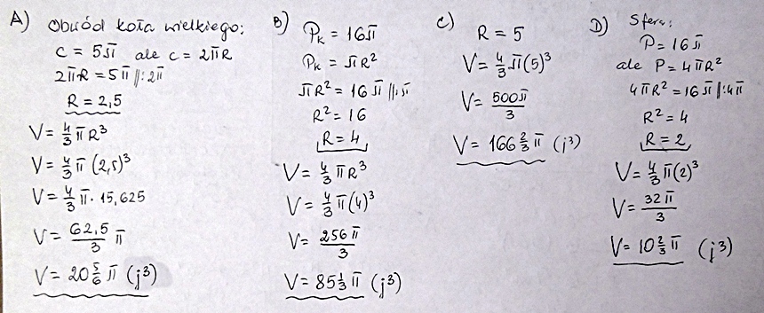 oblicz objętość kuli mając dane ; A) obwód koła wielkiego=5 pi B) pole koła =16 pi C) promień koła =5 D) sfera= 16pi