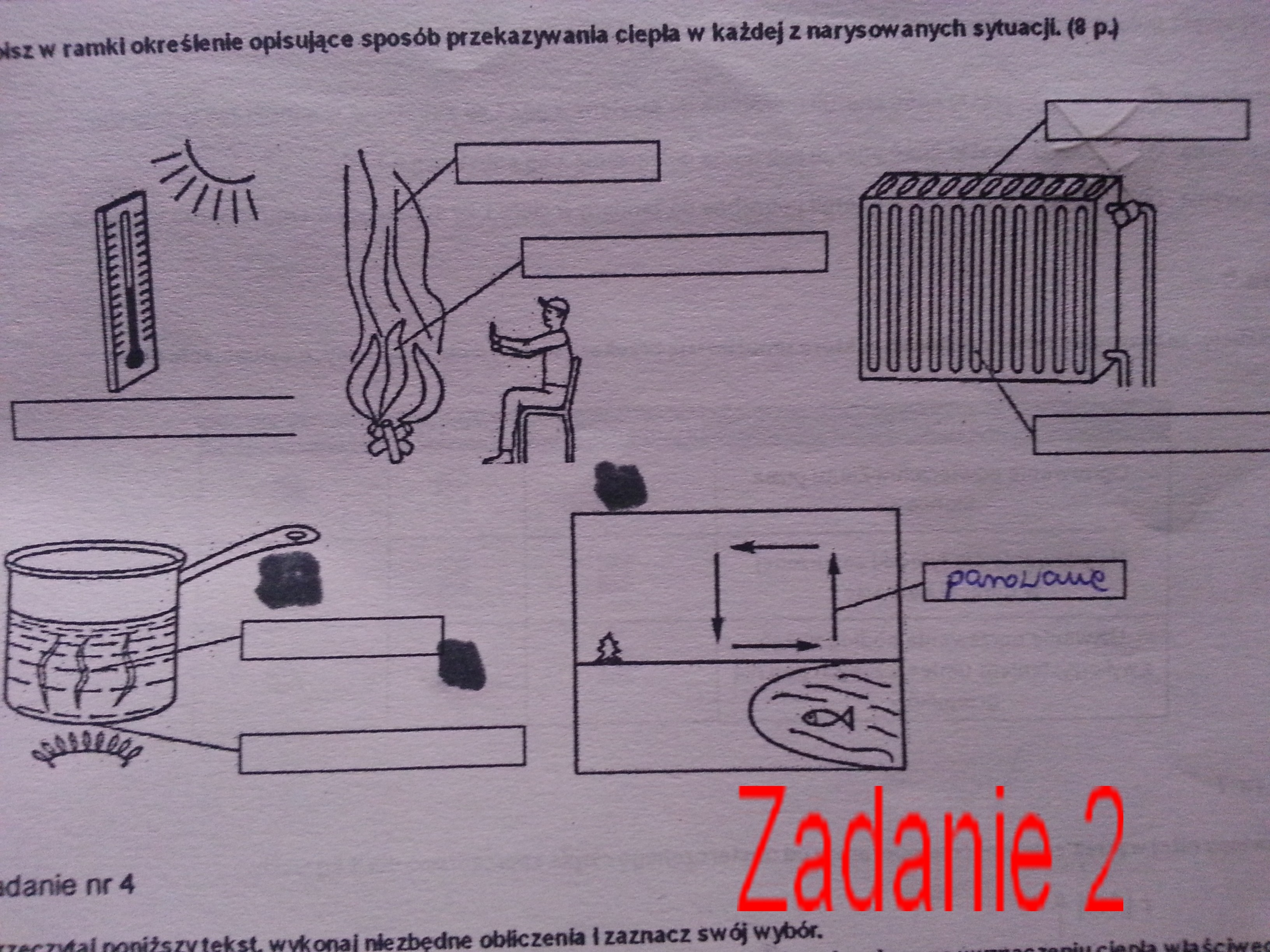 Wpisz w ramki określenie opisujące sposób przekazywania ciepła w każdej z narysowanych sytuacji.