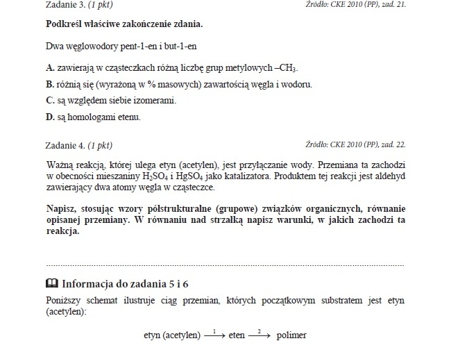 Zad.3. odp.D Pent-1-en i but-1-en są homologami etenu. zad.4. CH \equiv CH + H_{2}O \xrightarrow {H_{2}SO_{4},HgSO_{4}} CH_{3}-CHO powstaje etanal (aldehyd octowy) ten aldehyd lepiej napisać półstrukturalnie tak : ..............O ............// CH3-C ............\ ..............H