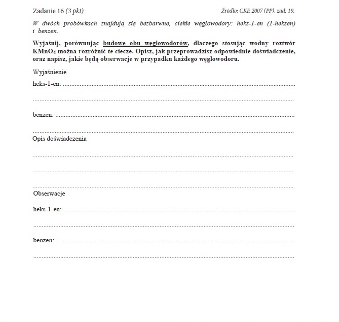 Do probówek napełnionych roztworami heks-1-enu i benzenu wlewamy trochę rozcieńczonego roztworu KMnO4. Probówki zamykamy szybko korkami gumowymi i wstrząsamy przez chwilę. Obserwujemy wynik doświadczenia.