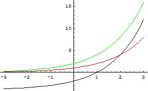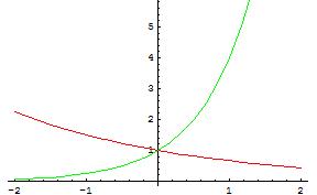 4^x - zielony, cały czas rośnie. (2/3)^x - czerwony, cały czas maleje.