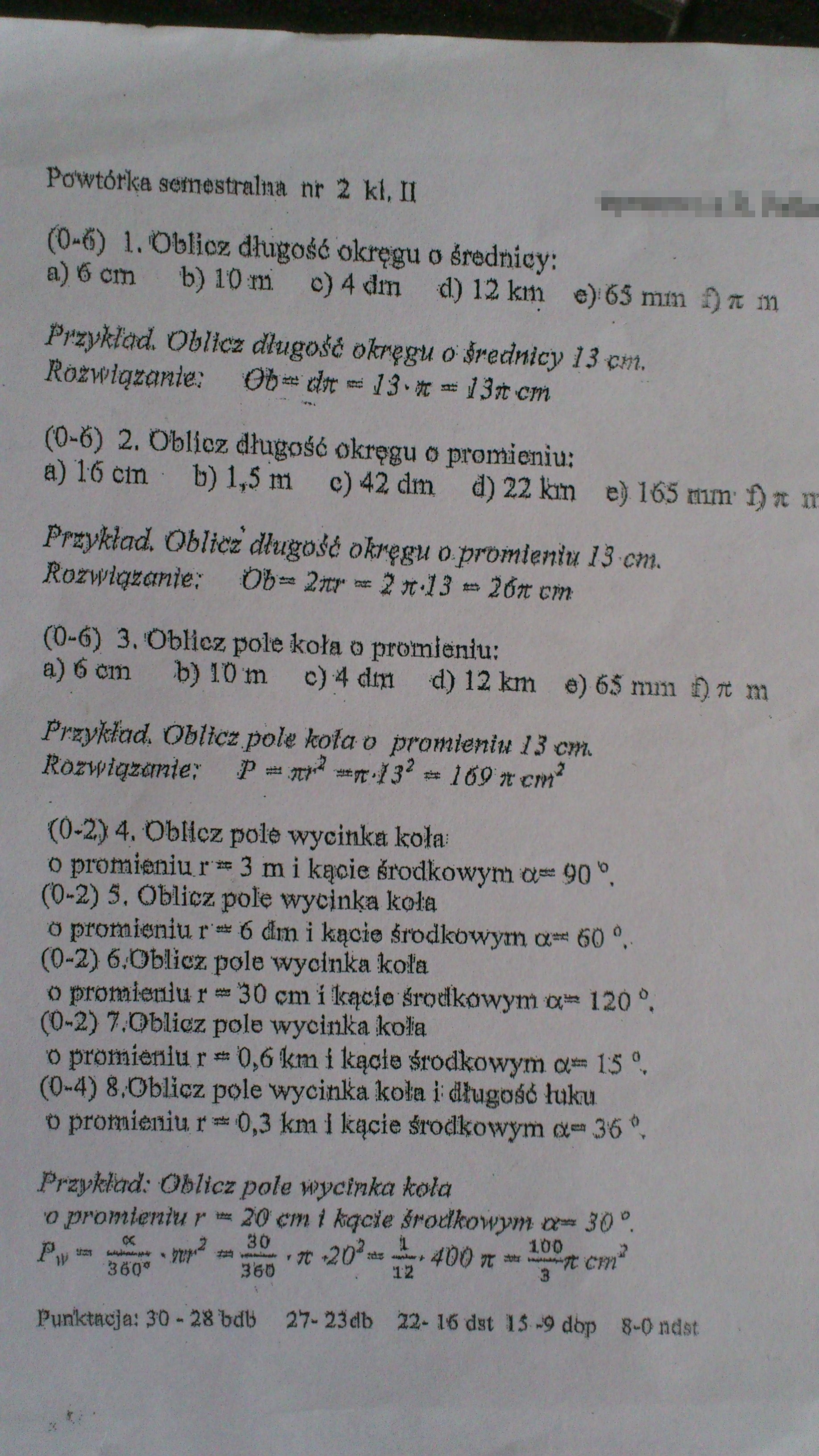Pole P wycinka koła o promieniu r i kącie środkowym alfa (w stopniach) wynosi: