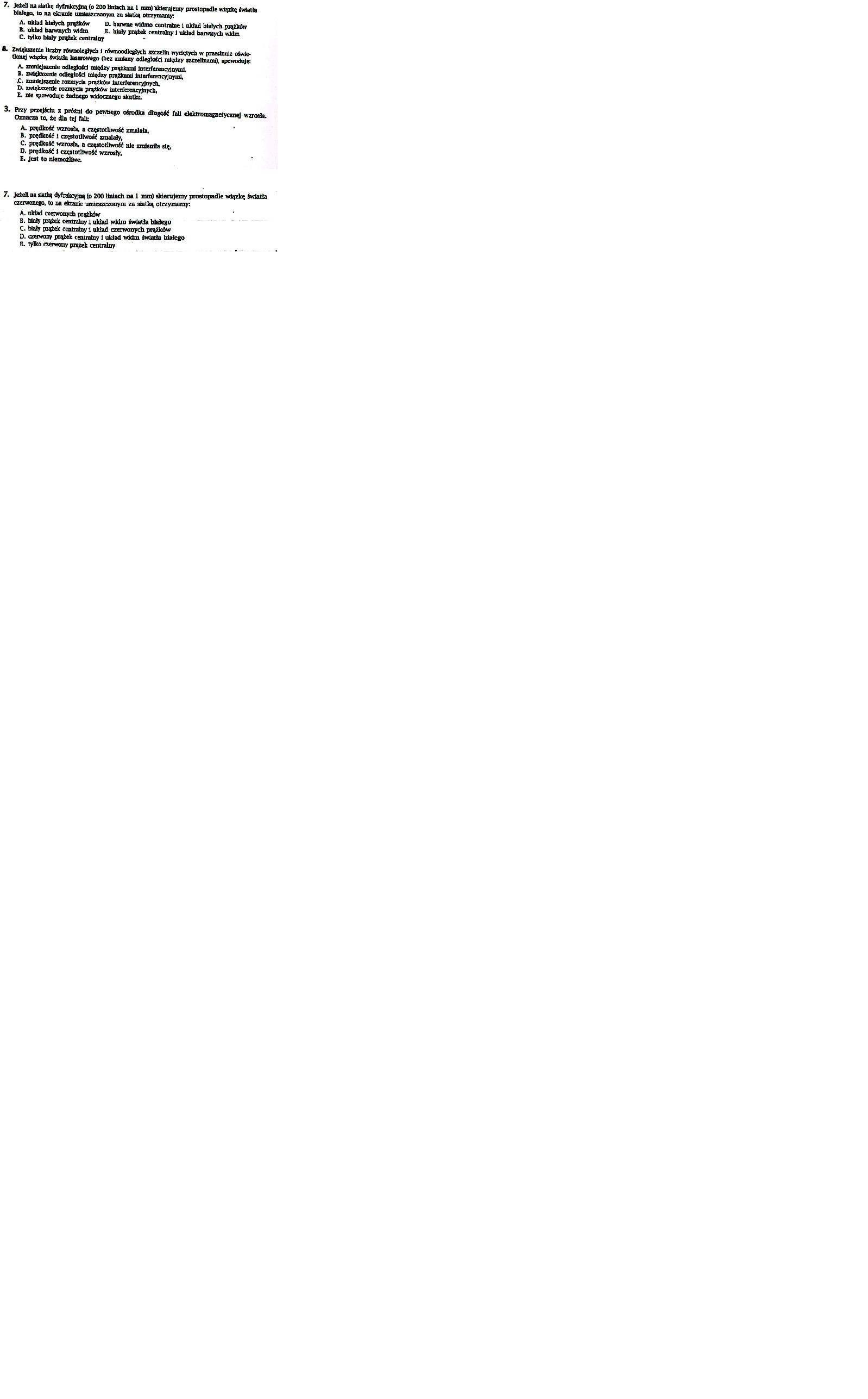 Nie zdążyłem dopisać do zadania 8, okres edycji minął: Rozmycie prążków dyfrakcyjnych na 1 szczelinie bierze się stąd, że do danego punktu ekranu docierają fale z całej szczeliny, nie tylko z jej końców (jak to jest przyjmowane w "szkolnym" modelu). Dlatego fazy tych fal jednak są nieco różne i nie jest tak, że wszystkie fale znoszą się wzajemnie wszędzie poza jednym punktem. Właśnie dlatego zwiększenie ilości szczelin zwiększa szansę na istnienie "przeciwniczki" dla danej fali.
