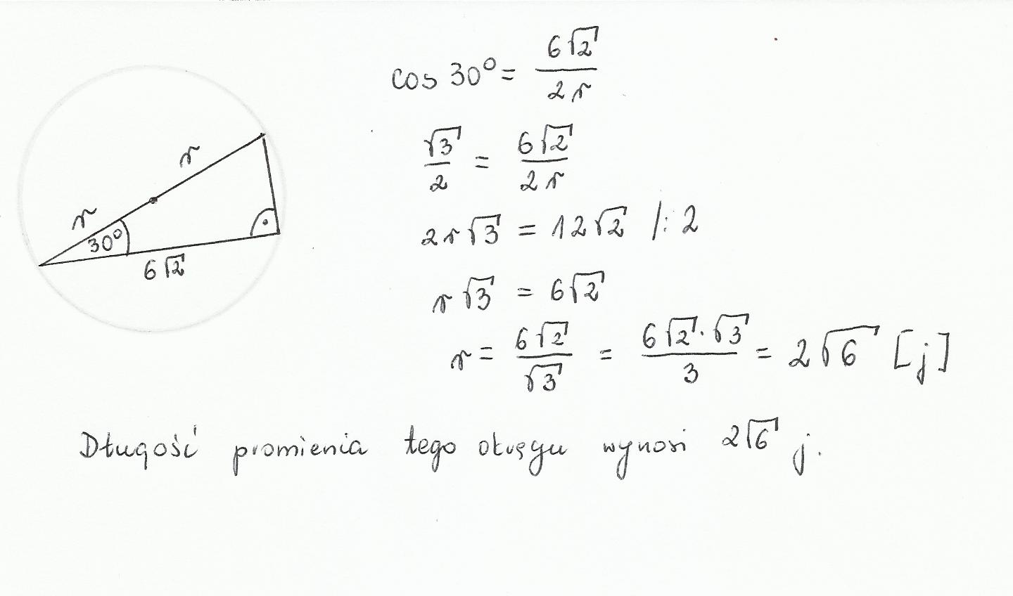 Oblicz długość promienia okręgu opisanego na trójkącie prostokątnym o kącie ostrym 30° i dłuższej przyprostokątnej 6√2