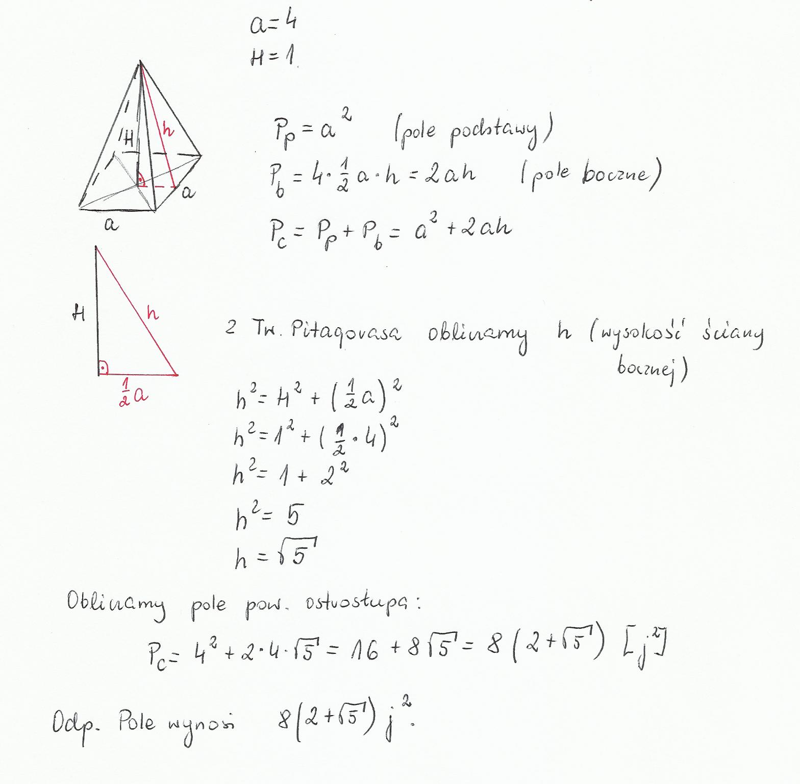 Oblicz pole powierzchni ostrosłupa prawidłowego czworokątnego o krawędzi podstawy równej 4 i wysokości równej 1