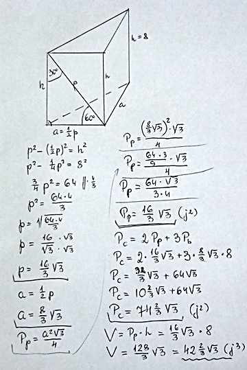 Oblicz v i pc graniastosłupa prawidlowego trójkatnego wiedzac ze wysokosc tego graniastoslupa ma 8 a kąt nachylenia przekatnej sciany bocznej do plaszczyzny podstawy ma miare 60 stopni