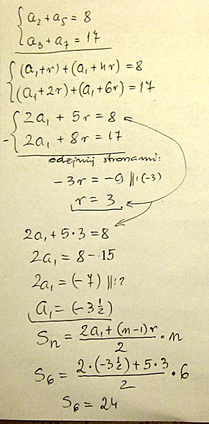 Wyznacz pierwszy wyraz i różniecę ciagu arytmetycznego(an) oraz wyznacz S6 majac dane a2+a5=8 i a3+a7=17
