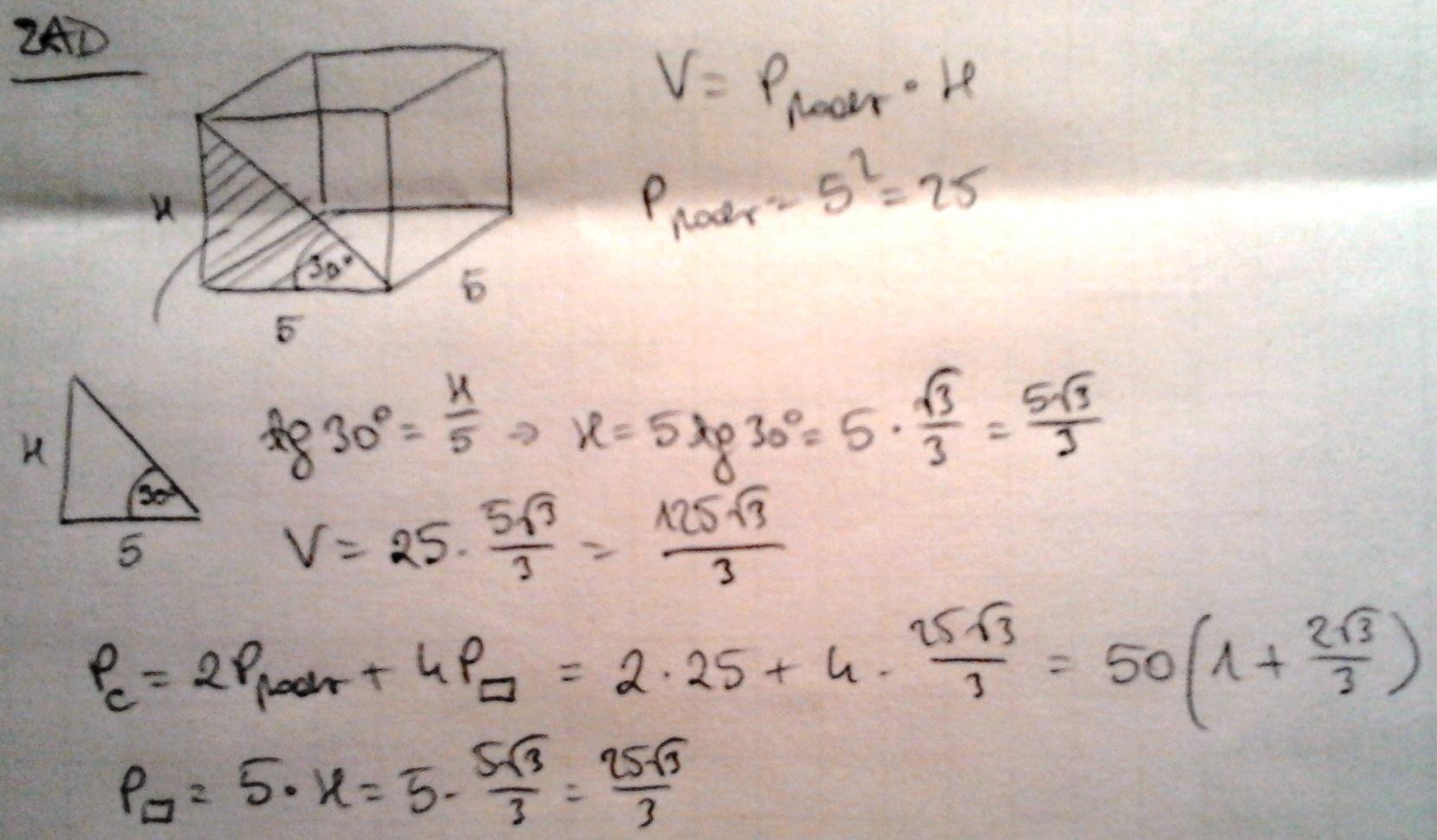 Zad1.Krawędź podstawy graniastosłupa prawidłowego czworokątnego ma dlugość 5 cm.Oblicz pole powierzchni całkowitej tego graniastoslupa,jeśli przekatna jego ściany bocznej tworzy z krawędzia podstawy kąt 30s