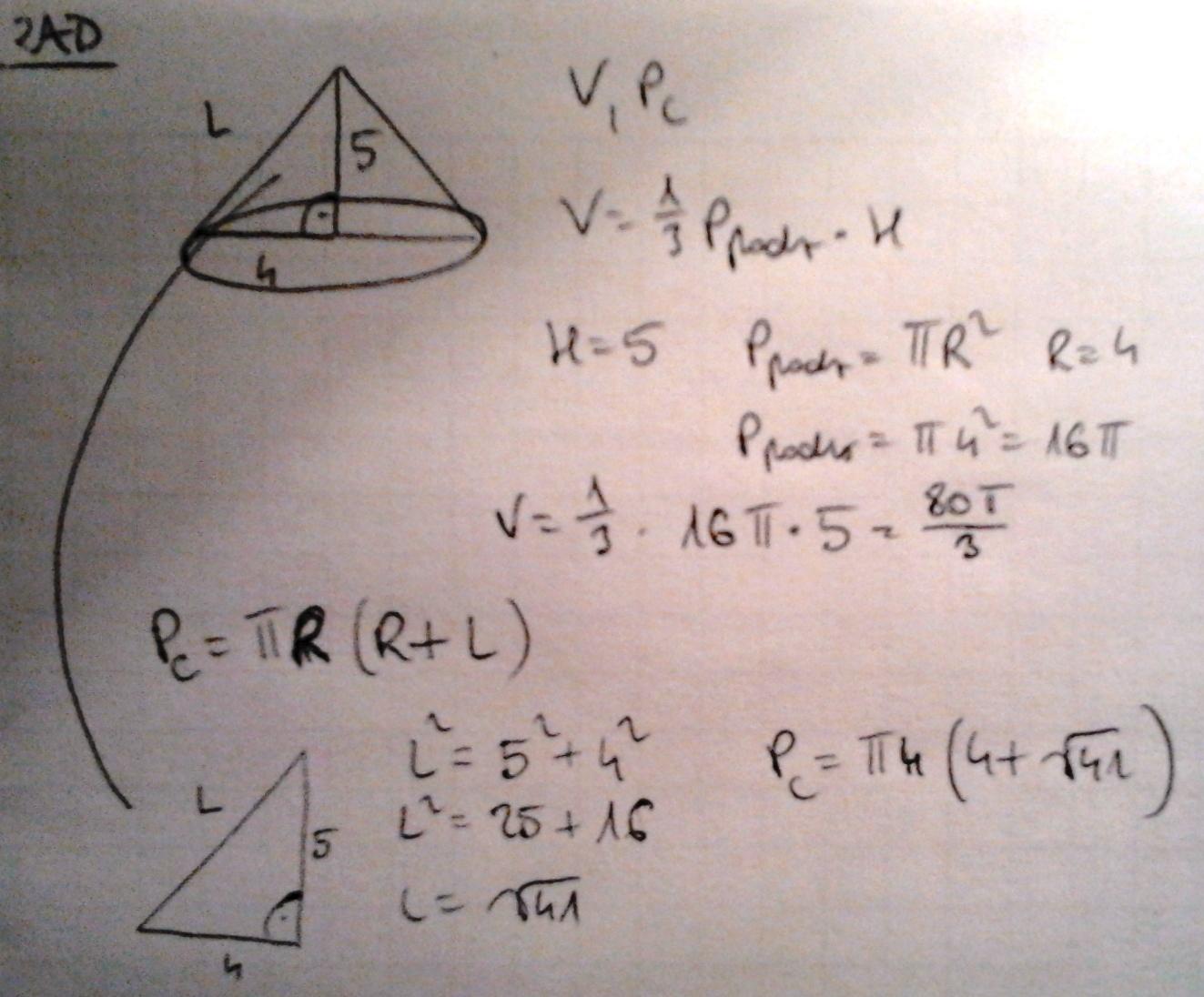 Zad 2. Dany jest trójkąt prostokątny o przyprostokątnych długości 4 i 5.Oblicz objętość bryły otrzymanej przez obrót tego trójkąta wokół dłuższej przyprostokątnej.