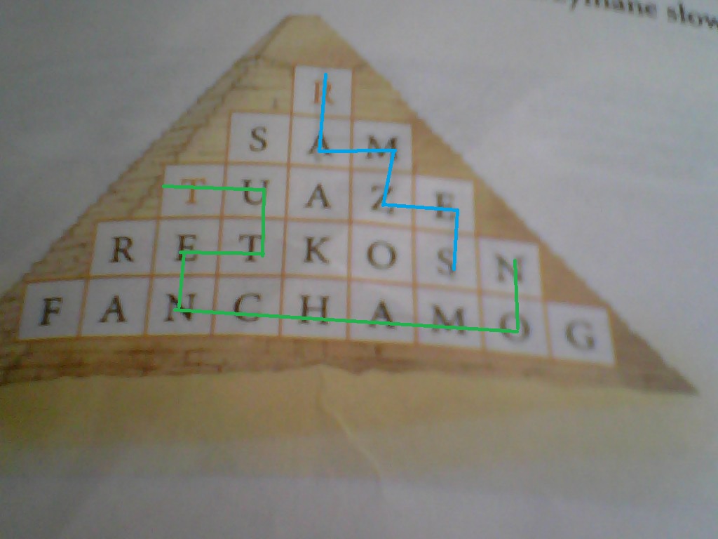Wykreśl z diagramu imiona dwóch władców starożytnego Egiptu. Rozpocznij od zaznaczonych liter, a następnie poruszaj się w górę, w dół, w prawo lub w lewo. Pozostałe litery utworzą hasło. Wyjaśnij, co oznacza otrzymane słowo.