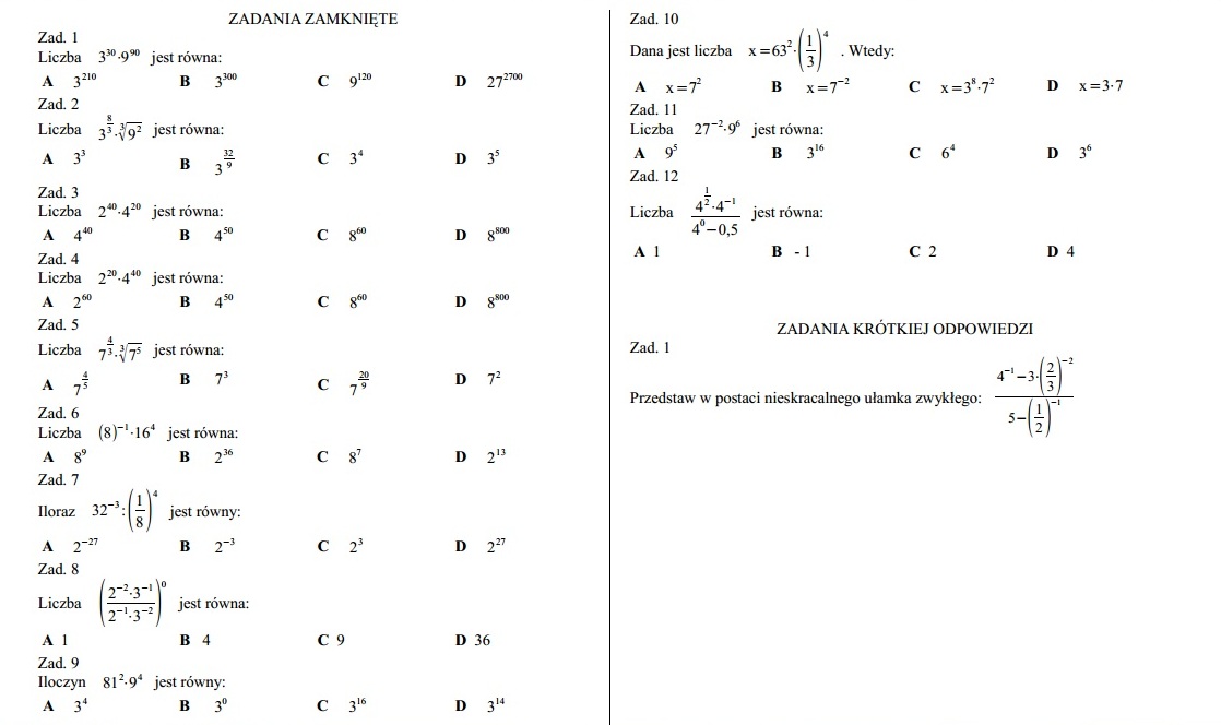 Każda niezerowa liczba w potędze 0 jest równa 1. Odp. A.