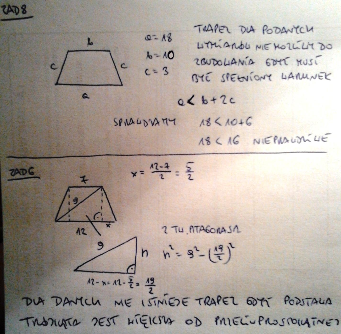 zad.8 oblicz obwód i pole trapezu równoramiennego o postawach długości 10cm i 18cm oraz ramieniu równym 3cm