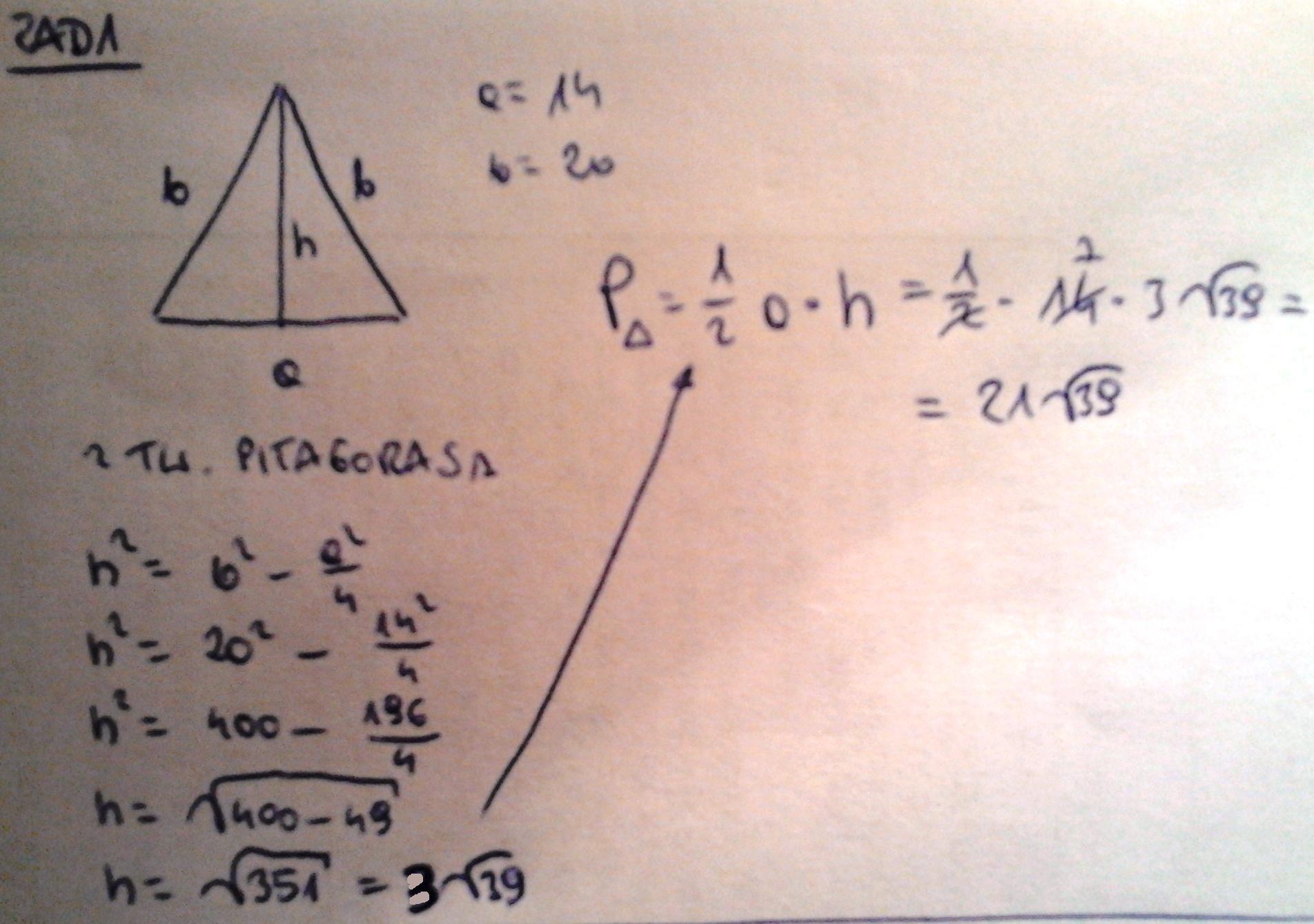 zad.1 oblicz pole trójkąta równoramiennego , jeżeli długość podstawy jest równa 14cm a długość ramienia 20cm