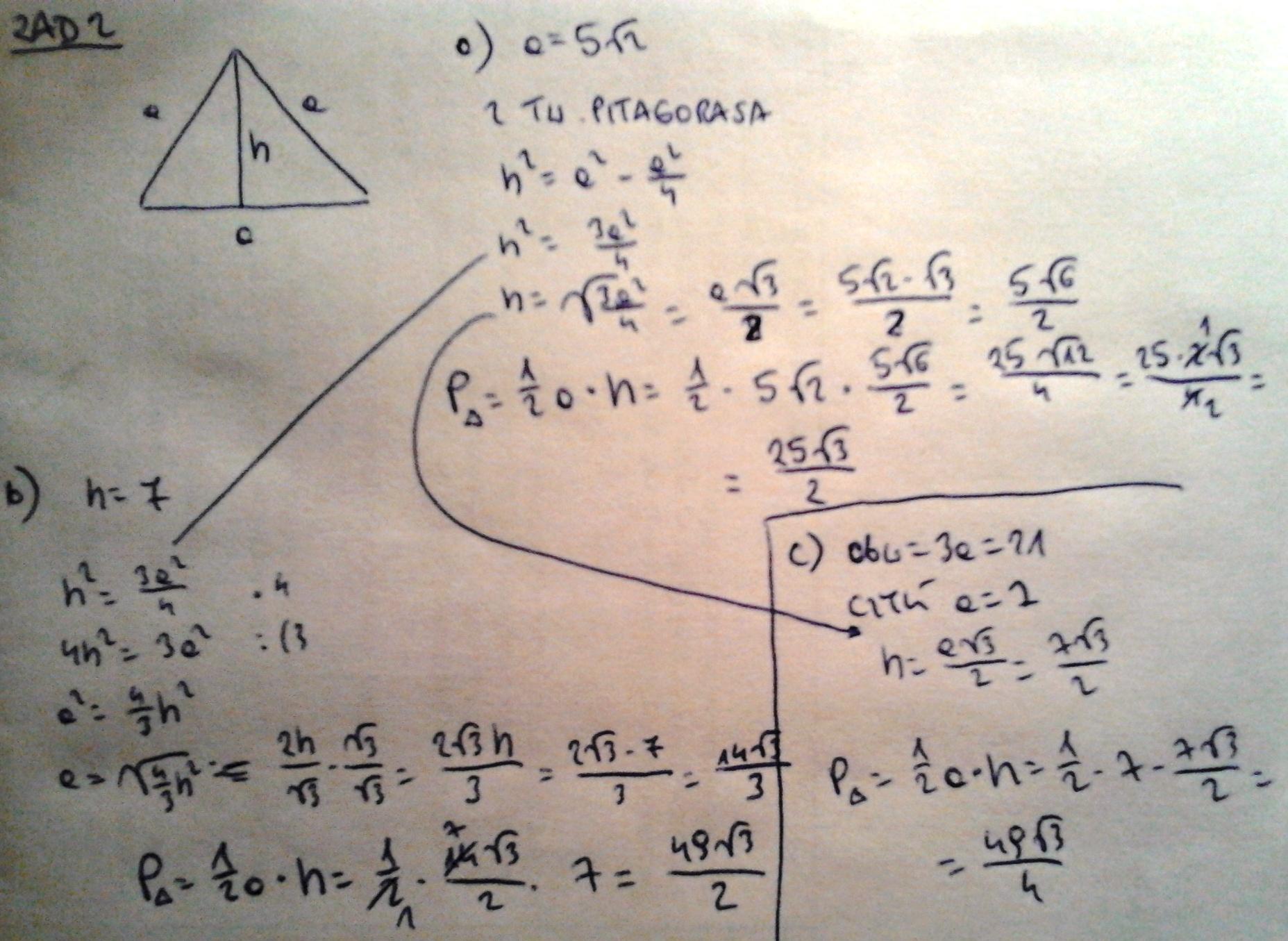 zad.2 oblicz pole trójkąta równobocznego jeśli a)długość boku jest równa 5√2cm b) wysokość jest równa 7cm c) obwód jest równy 21cm