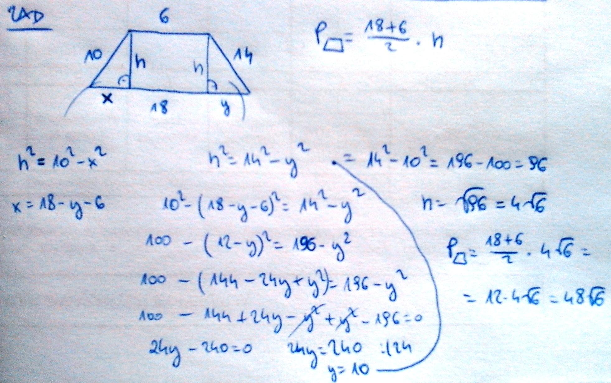 Podstawy trapezu mają długości 6 i 18 a ramiona 10 i 14.Oblicz pole tej figury