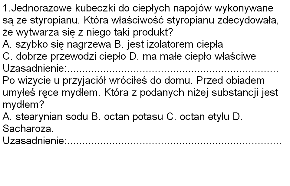 Uzasadnienie: Styropian posiada znakomite właściwości izolacyjne, które wynikają z jego niskiego współczynnika przewodzenia ciepła, czyli ciepłe napoje w nim podawane dłużej będą zachowywały swoją temperaturę. Styropian nie jest rozpuszczalny w wodzie, nie ulega pęcznieniu i nie wchłania wody, wobec czego nadaje się do podawania napojów.