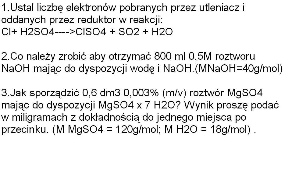 odp. aby zrobić 800 ml roztworu NaOH o stęż. molowym = 0,5mol/dm^3 należy odważyć 16 g NaOH i uzupełnic wodą destylowaną w kolbie miarowej do 800 cm^3