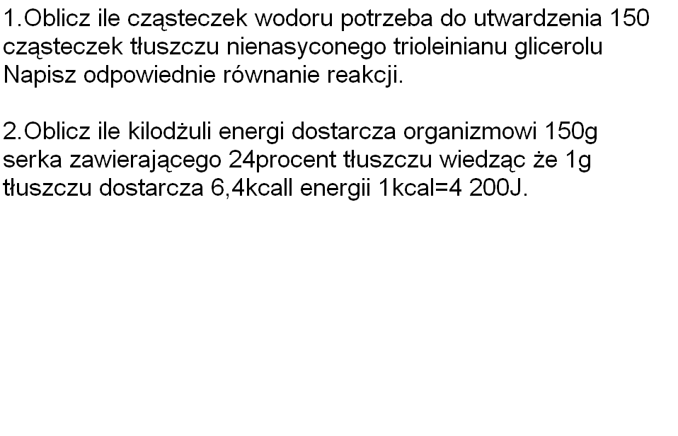 1 cząsteczka trioleinianu glicerolu reaguje z 3 cząsteczkami wodoru dając 1 cząsteczkę tristearynianu glicerolu