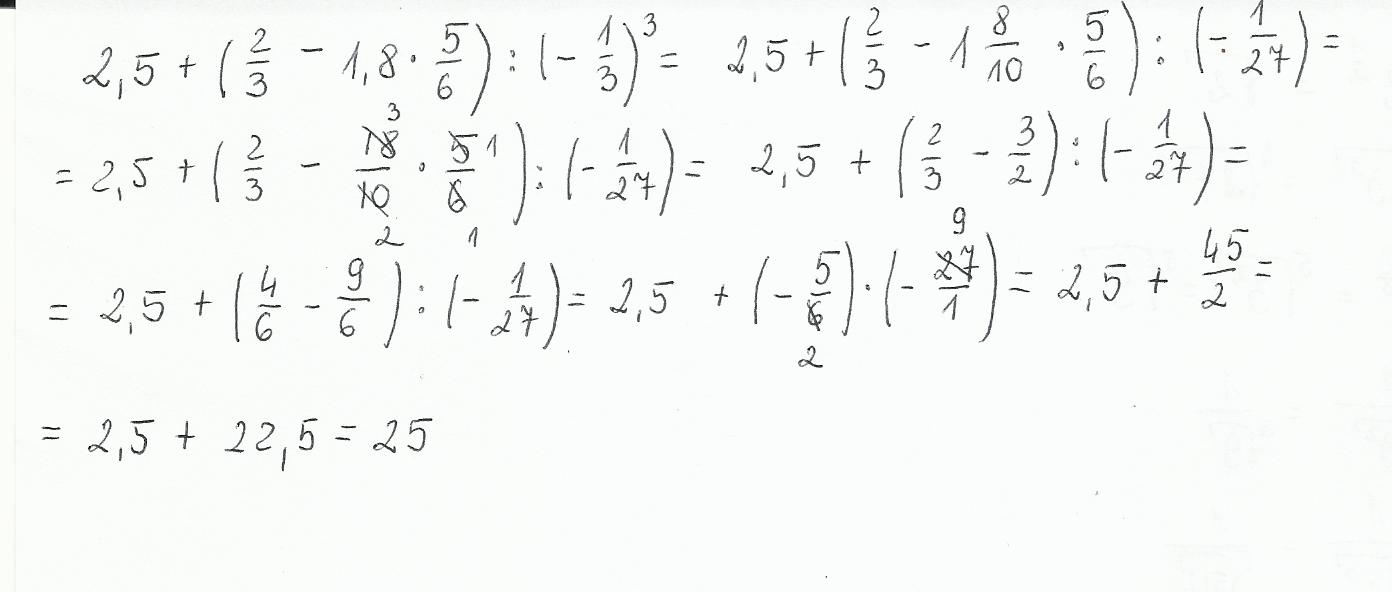 2,5+(2/3 -1,8 * 5/6) :(-1/3)^3=