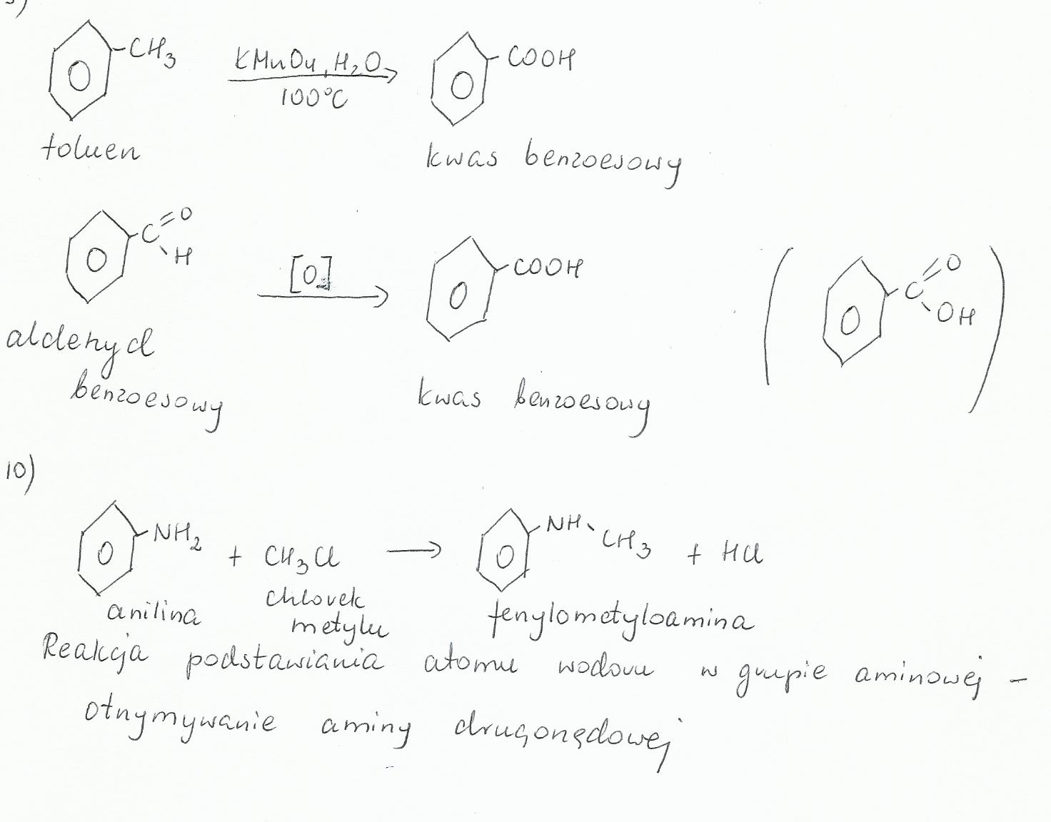 9. Pewien aldehyd poddano utlenianiu i w wyniku reakcji uzyskano produkt , który jest identyczny z produktem utleniania toluenu manganianem(VII)potasu. Zapisz schemat reakcji utleniania obu związków