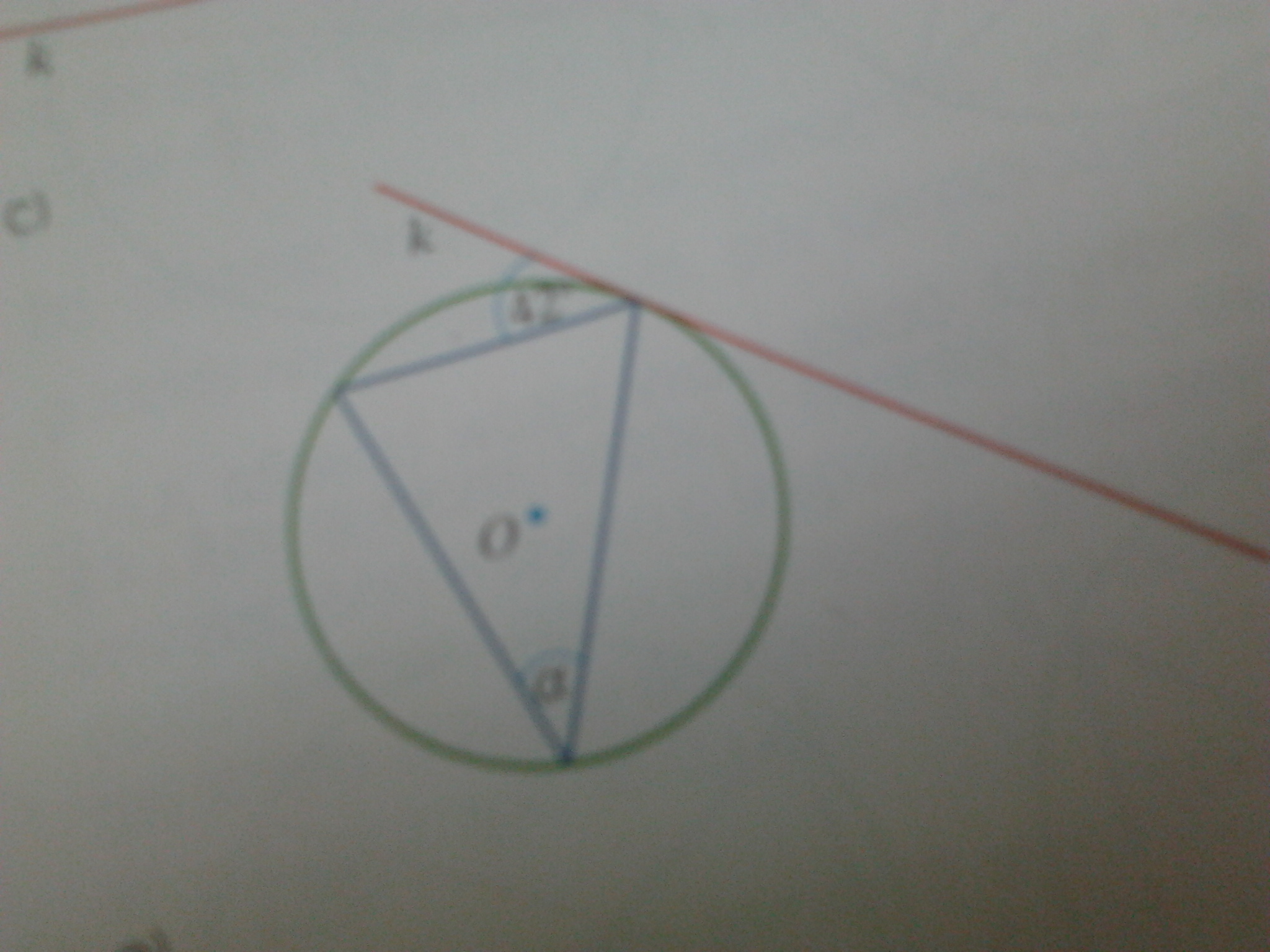 Każdy rysunek przedstawia okrąg o środku O oraz styczną (w ostatnim podpunkcie dwie styczne) do tego okręgu.Oblicz miarę kąta α.