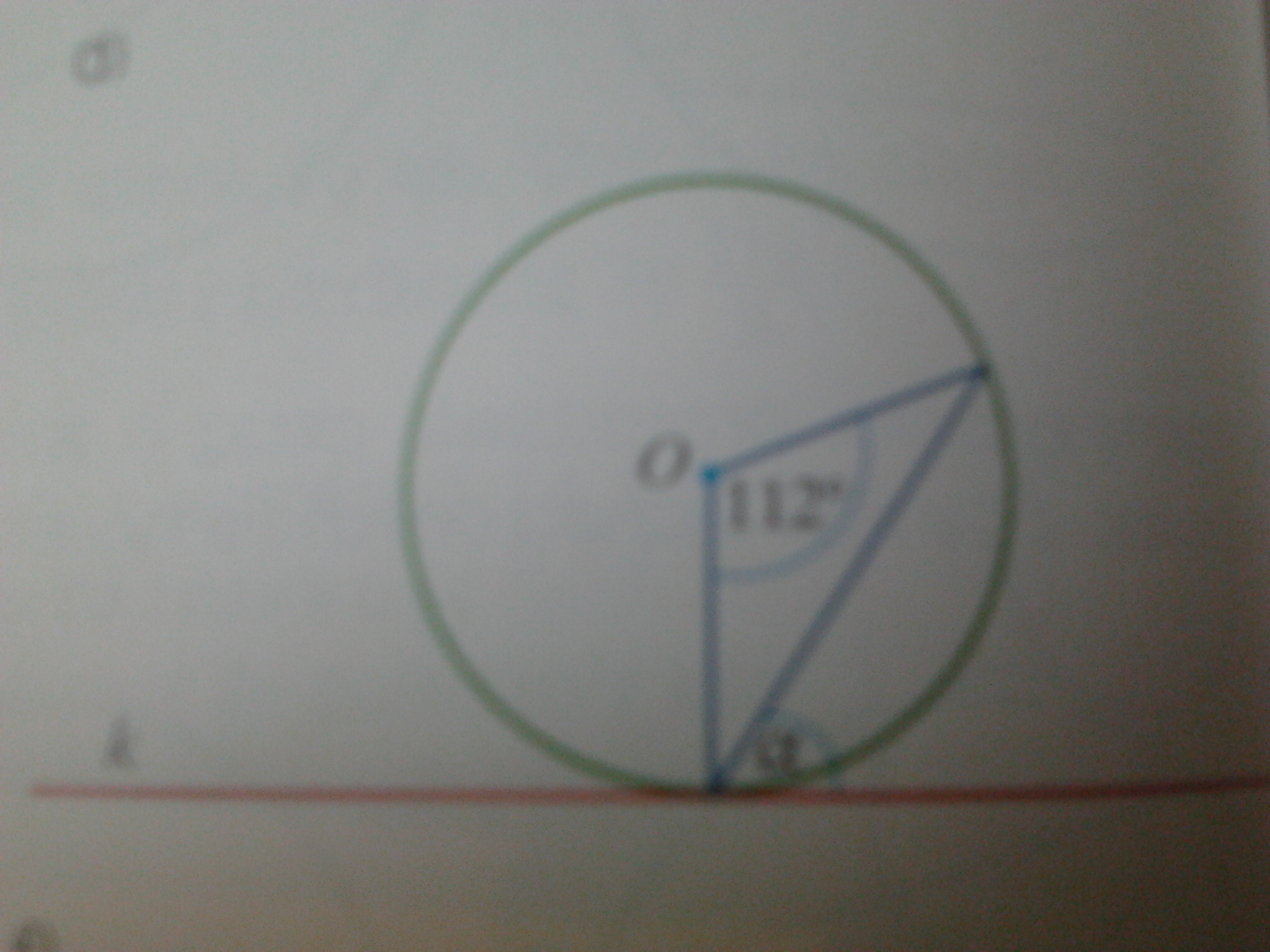 Kąt OAB jest uzupełnieniem zaznaczonego kąta 42 stopnie do 90, więc wynosi 48 stopni. Ponieważ trójkąt ABO jest równoramienny (jego dwa boki są promieniami okręgu) to kąt OBA także wynosi 48 stopni, a kąt AOB uzupełnia sumę kątów w trójkącie AOB do 180 stopni, więc wynosi: