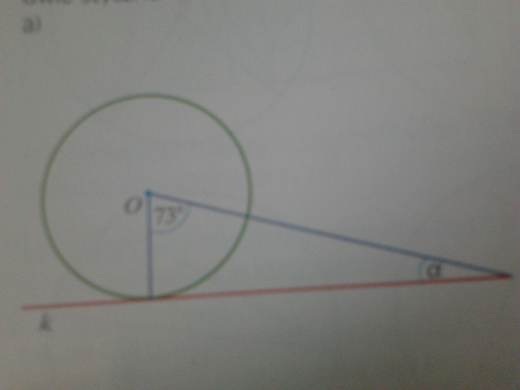 W zadaniu wykorzystuje się fakt, że styczna do okręgu jest prostopadła do promienia okręgu (tego niebieskiego promienia narysowanego z punktu O do punktu styczności) Wobec tego trójkąt zawierający kąt alfa i kąt 73 stopni jest prostokątny (zawiera więc też kąt 90 stopni).