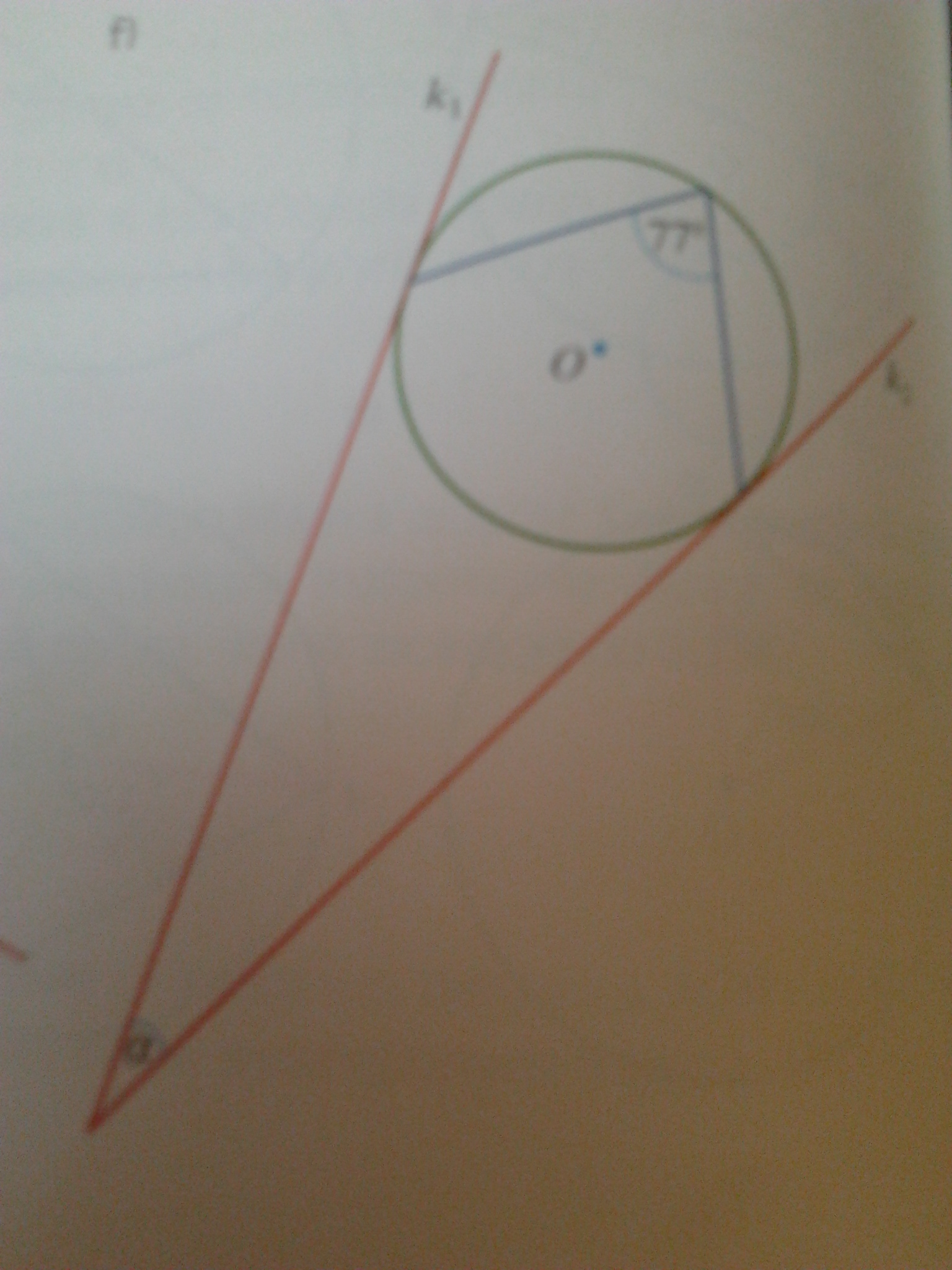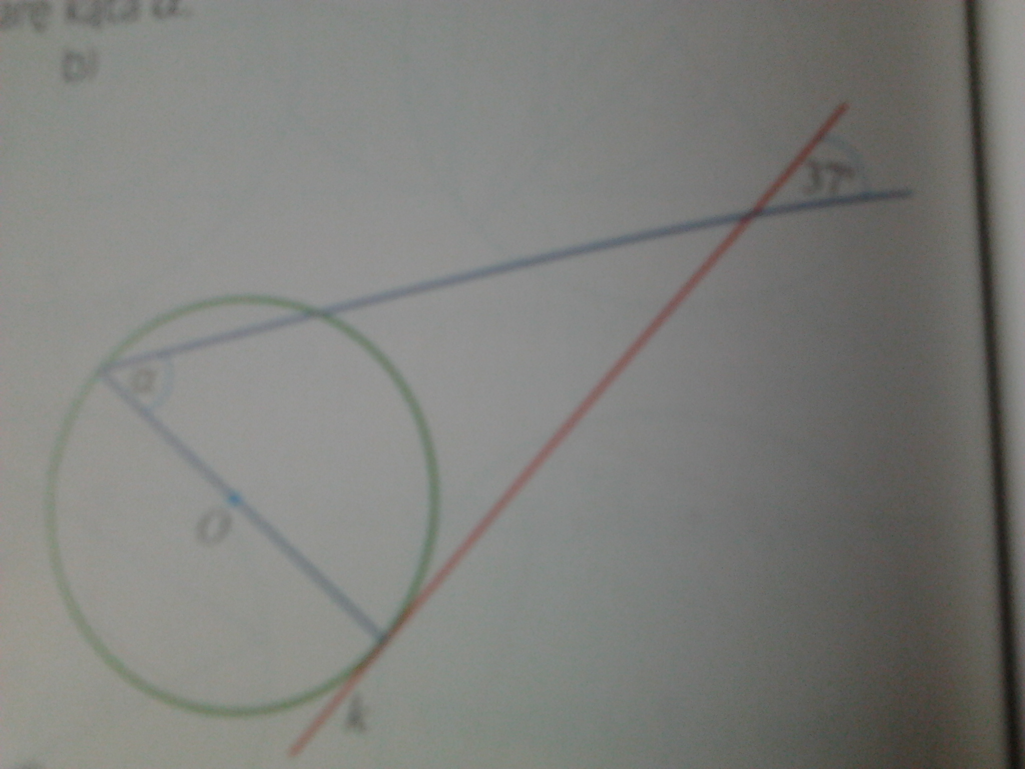 Ten kąt, dodany do alfa, ma dawać 90 stopni (bo promień okręgu jest prostopadły do stycznej) więc
