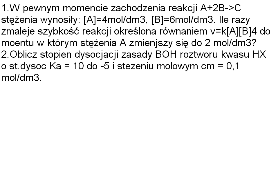 Zad.1. [A] = 4mol/dm^{3} [ B ]= 6mol/dm^{3} v=k[A][ B ]^{4} v_{1}=k[4][6]^{4}=k\cdot 5184 Jeżeli : [A] = 2mol/dm^{3} oznacza to ,że przereagowały 2 mole substancji A - równocześnie 4 mole substancji B (2 razy więcej), bo A + 2B ---> C czyli pozostanie substancji B :6 moli - 4 mole=2mole [ B ]= 2mol/dm^{3} v_{2} = k[2][2]^{4}=k\cdot 32 \frac {v_{1}} {v_{2}}=\frac {k\cdot 5184} {k\cdot 32}=162 Prędkość reakcji zmaleje 162 razy. Zad.2. K_{a}=10^{-5} C_{m}=0,1mol/dm^{3} Sprawdzamy czy można zastosować uproszczony wzór Ostwalda : \frac {C_{m}} {K_{a}}=\frac {0,1} {10^{-5}}=0,1\cdot 10^{5}=10 000 można zastosować,bo jest większe od 400. Korzystamy z zależności : K_{a}=C_{m} \alpha^{2} \alpha = \sqrt {\frac {K_{a}} {C_{m}}} \alpha =\sqrt {\frac {10^{-5}} {0,1}}=\sqrt {10^{-4}} = 0,01=1\% Stopień dysocjacji wynosi 1%.